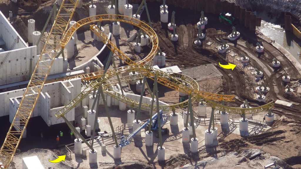 - Image #47: Aerial look at track so far for a dual-racing roller coaster in Epic Universe. Bottom arrow at safety railings. Nearby workers also give scale to this area. Right arrow at what seem to be conduit-type pipes.
