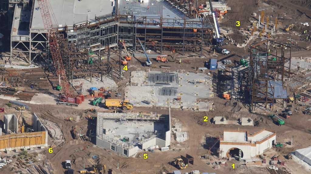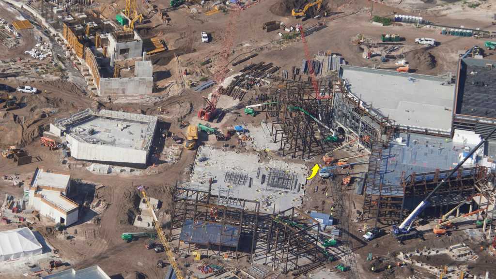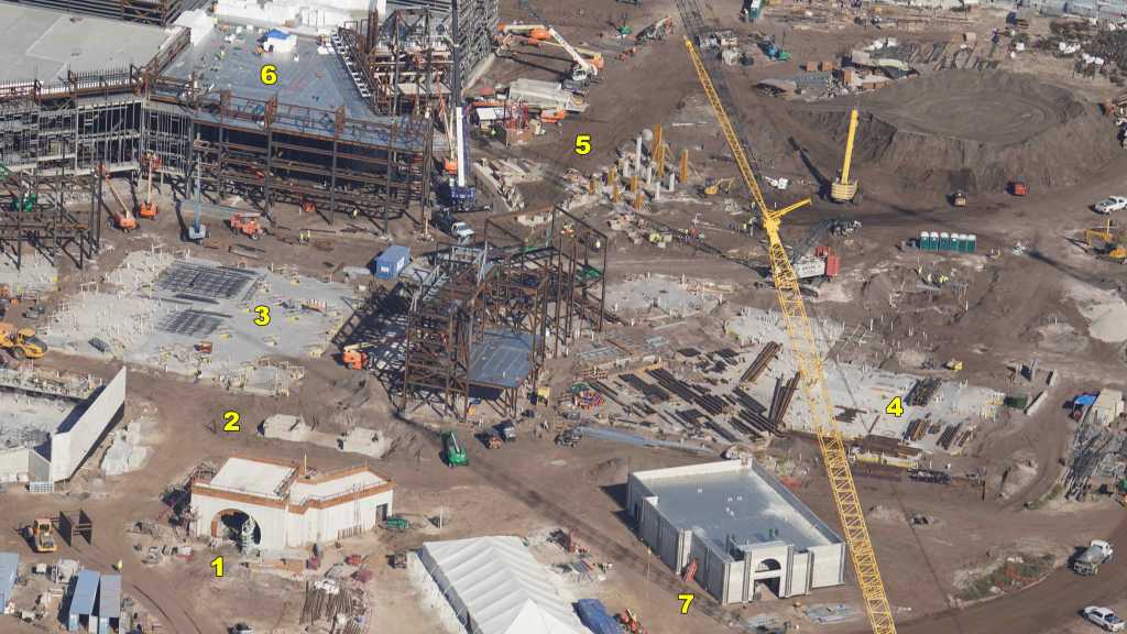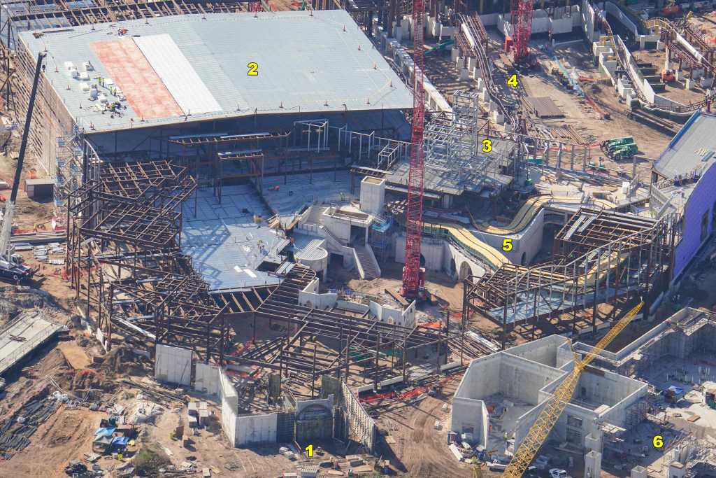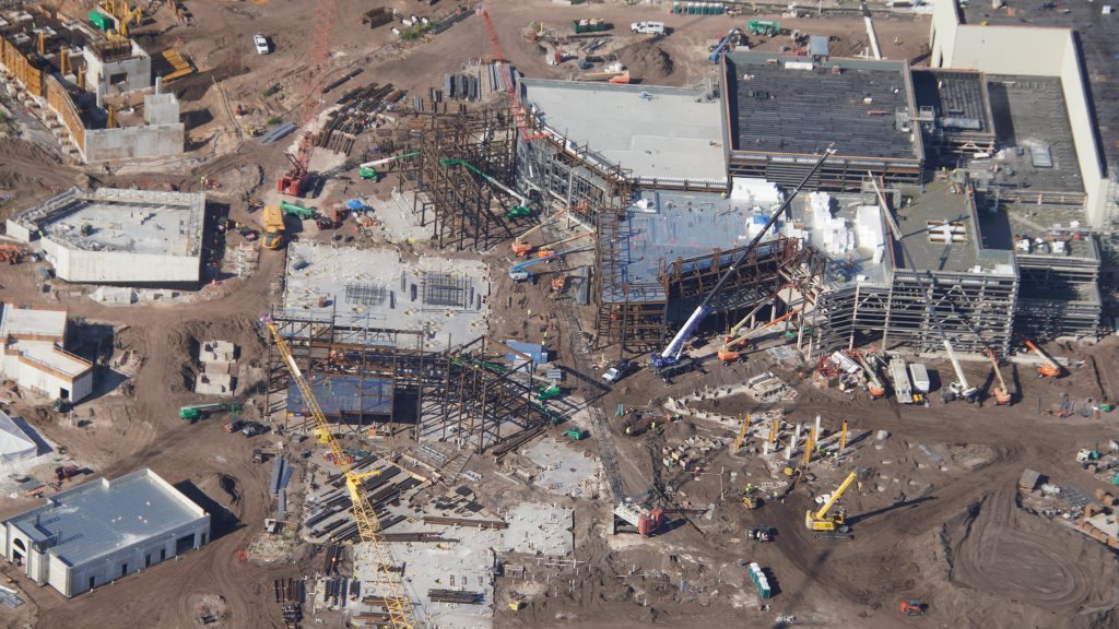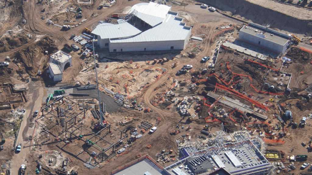 - Image #13: Aerial photo of building frame rising in Classic Monsters land. Also seen are interesting excavations at bottom right, near the featured attraction show building.