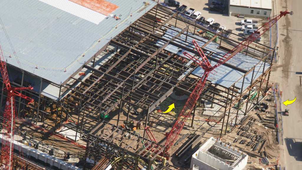 - Image #7: Aerial look at construction of the entrance to Universal’s Epic Universe. Arrows represent a circular courtyard between ticketing and the entrance gateway (at star). Pole at top was placed when the site was completely clear as a reference to approximate entrance of the park.