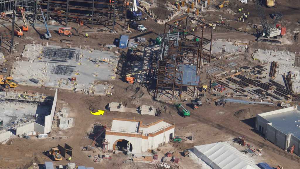 - Image #21: Aerial look at the front of a Harry Potter related land in Epic Universe. Arrow at what are likely foundations for a Porte Saint-Denis arch.