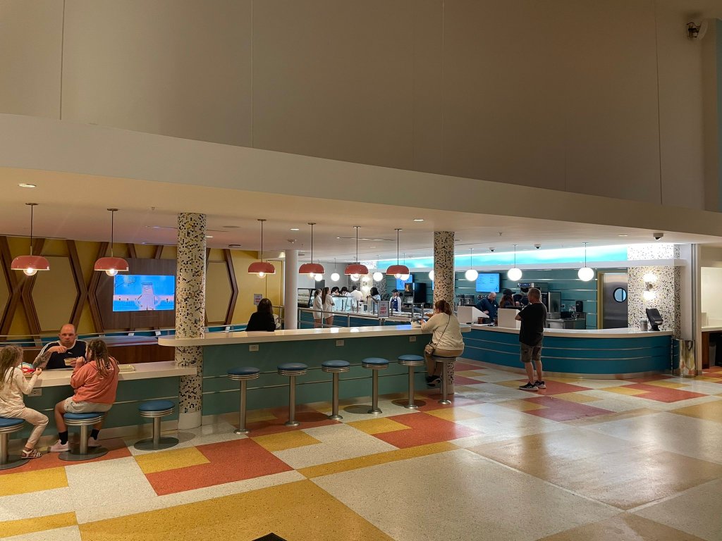 The malt shop serves milkshakes, sundaes, and more. Shakes Malt Shoppe is located right next to the Bayliner Diner seating area at Cabana Bay.