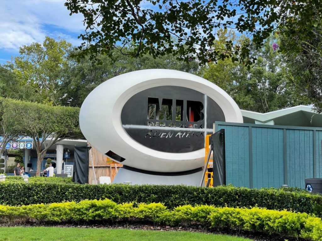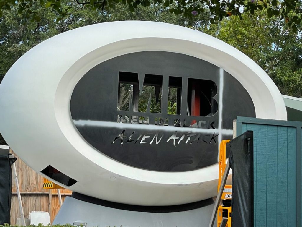 The Men in Black: Alien Attack attraction sign is currently undergoing refurbishment in the World Expo portion of Universal Studios Florida.
