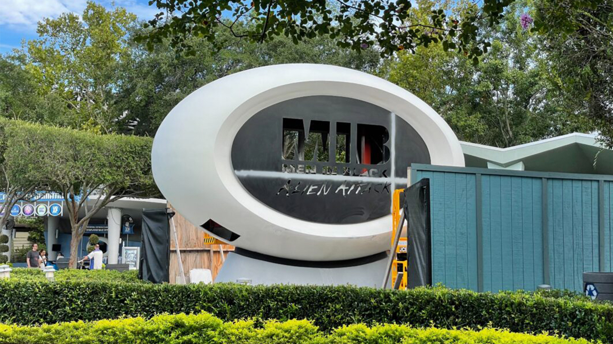 The Men in Black: Alien Attack attraction sign is currently undergoing refurbishment in the World Expo portion of Universal Studios Florida.