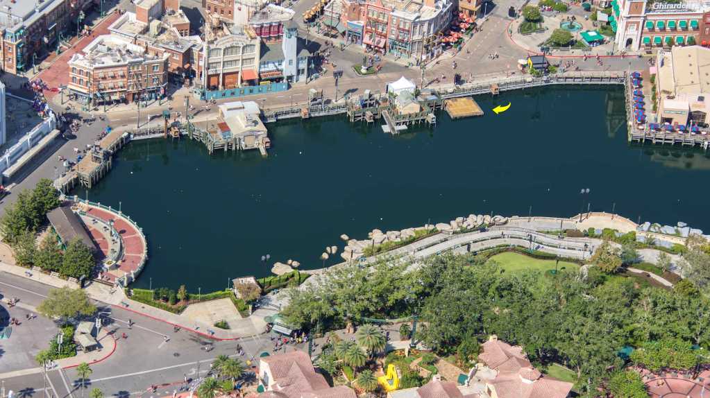 - Image #5: Aerial look at a section of the Universal Studios Lagoon. A show is in development. Many interesting buoys or floats have been positioned. Arrow where a barge has a freshly added surface.