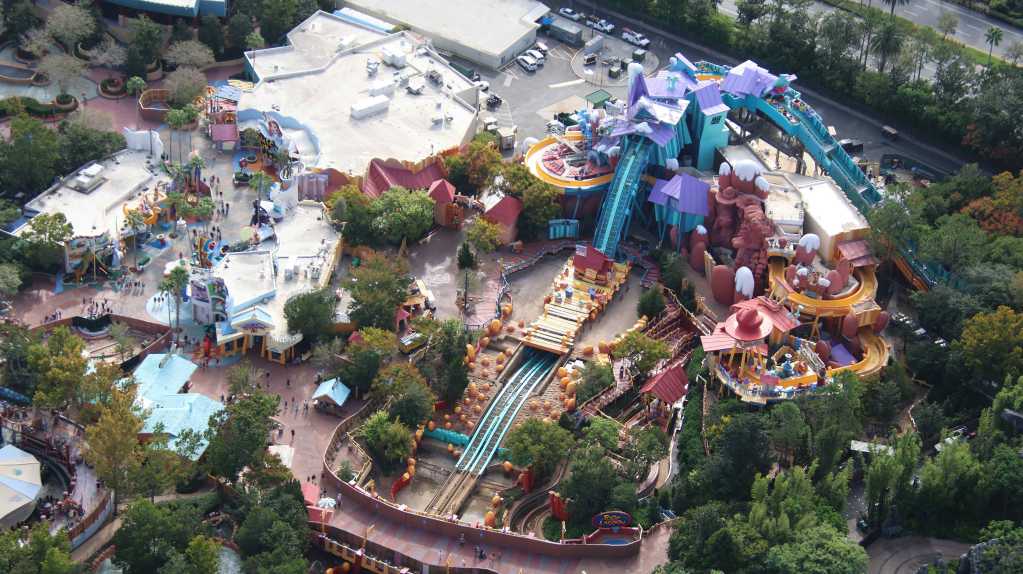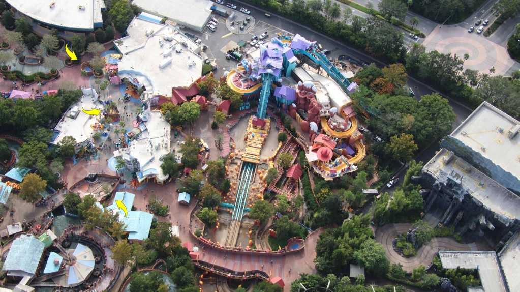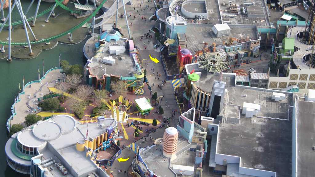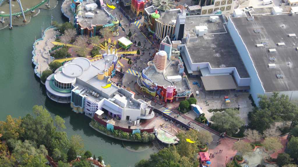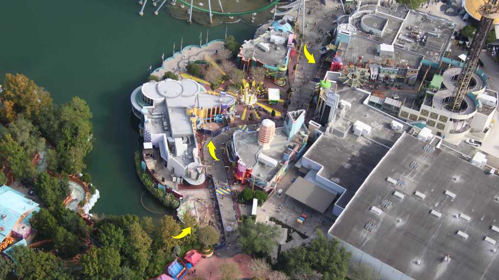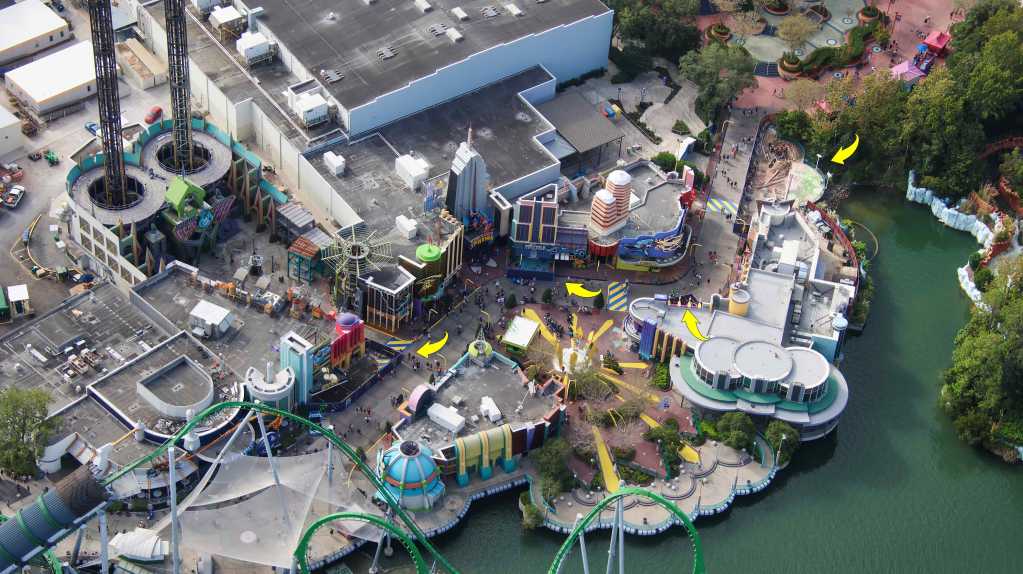 - Image #5: Aerial photo of Marvel Super Hero Island. At top right are facade details that mostly go unnoticed due to the entrance of Doctor Doom’s Fearfall. Arrows at refurbishments.