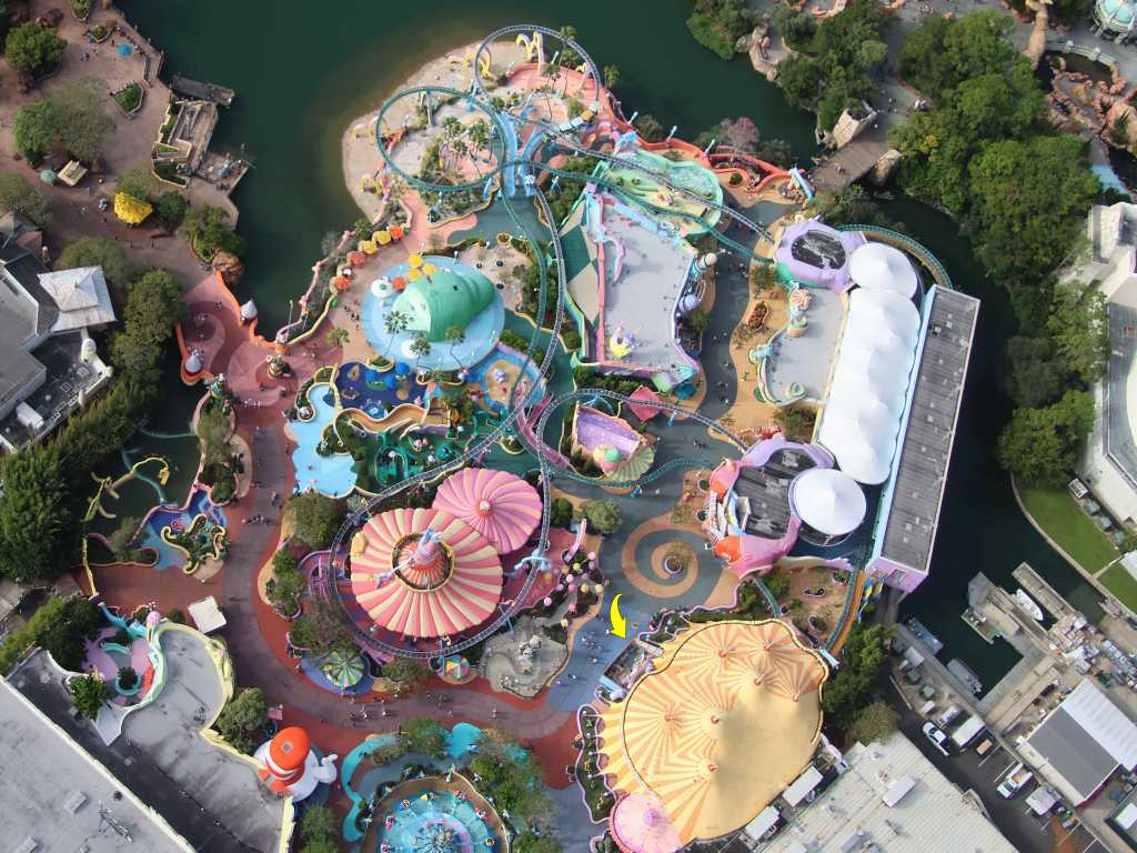 - Image #1: One track. Two track. Of the High in the Sky Trolley Train Ride we see! One track at carousel. Two tracks in the circus. Arrow at refurbishment of Cafe Stupendous. High in the Sky too, for this nearly straight-down view. Do you spot Grinchmas trees in Seuss Landing too?