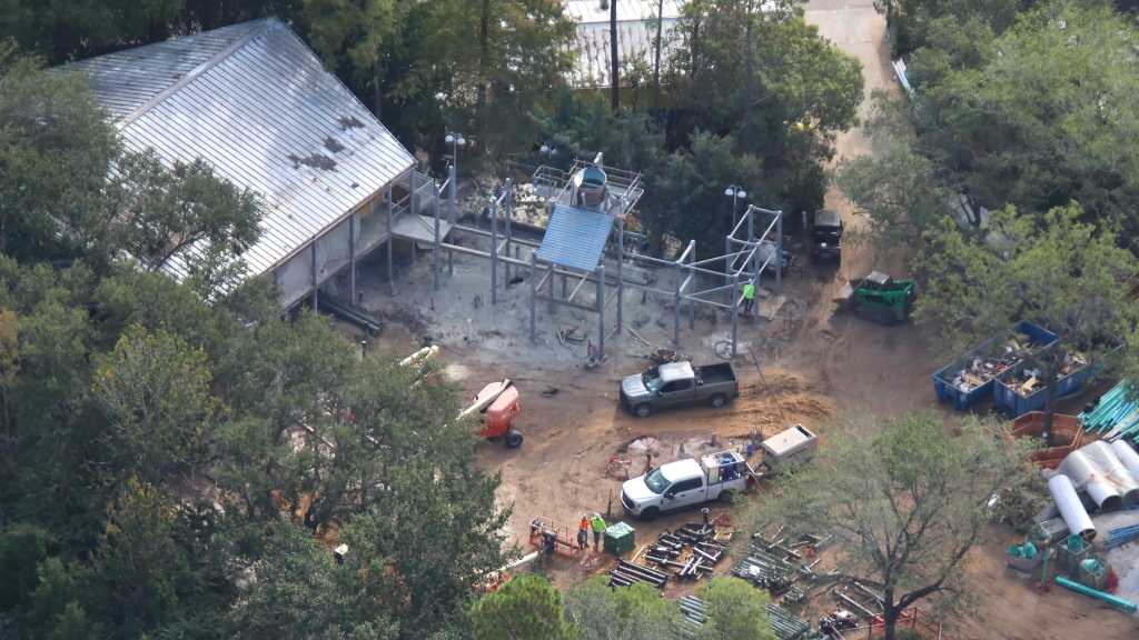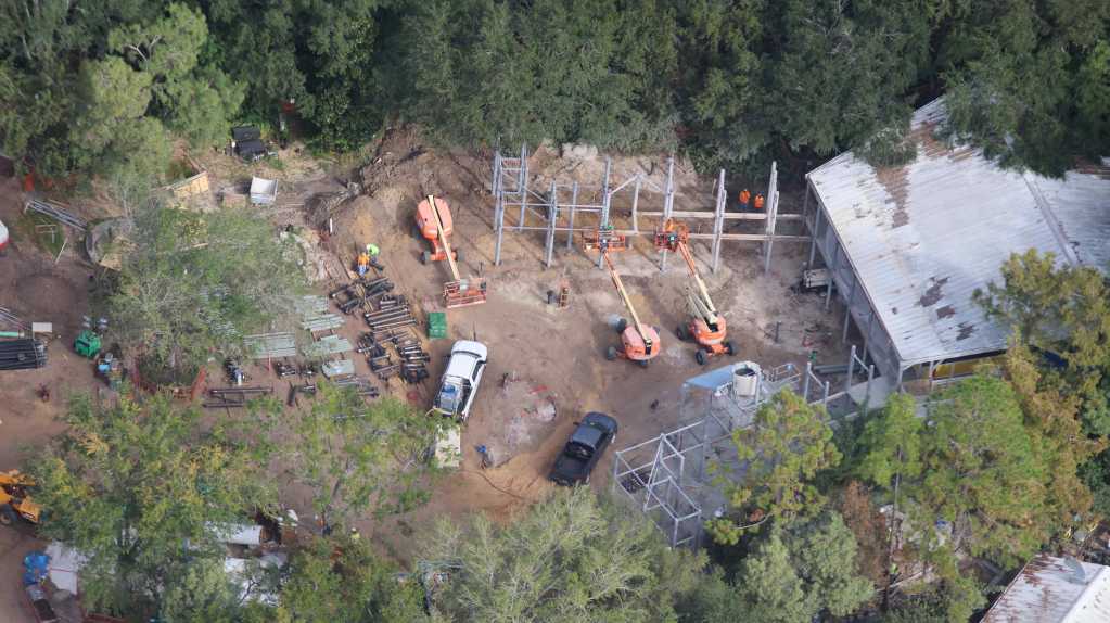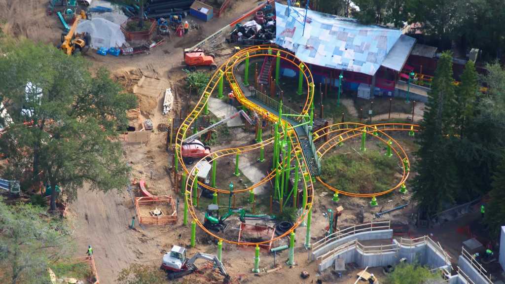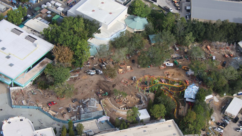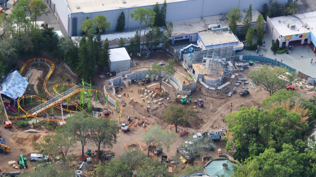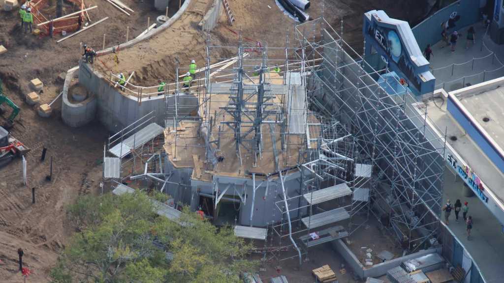 - Image #2: Aerial photo of scaffolding being placed at the wire frame of Shrek’s house [rumour at this time]. Sculpting to begin soon. Wall at the scaffolding is to block view of the project from the E.T. ride queue.
