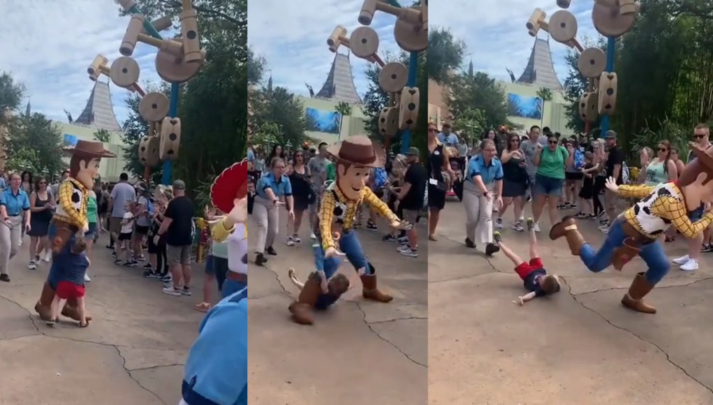 He was almost trampled. Watch the moment a child runs into the Woody character at Disney’s Hollywood Studios in the video below.