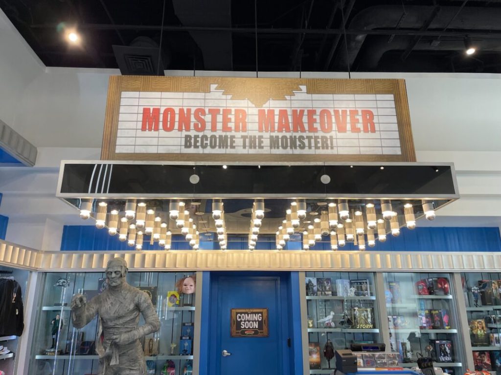 The photo below shows a “Coming Soon” sign on the door of Monster Makeover. Notice how the experience’s “wordmark” uses the same kind of lettering as the logo for Universal’s Horror Make-Up Show does.