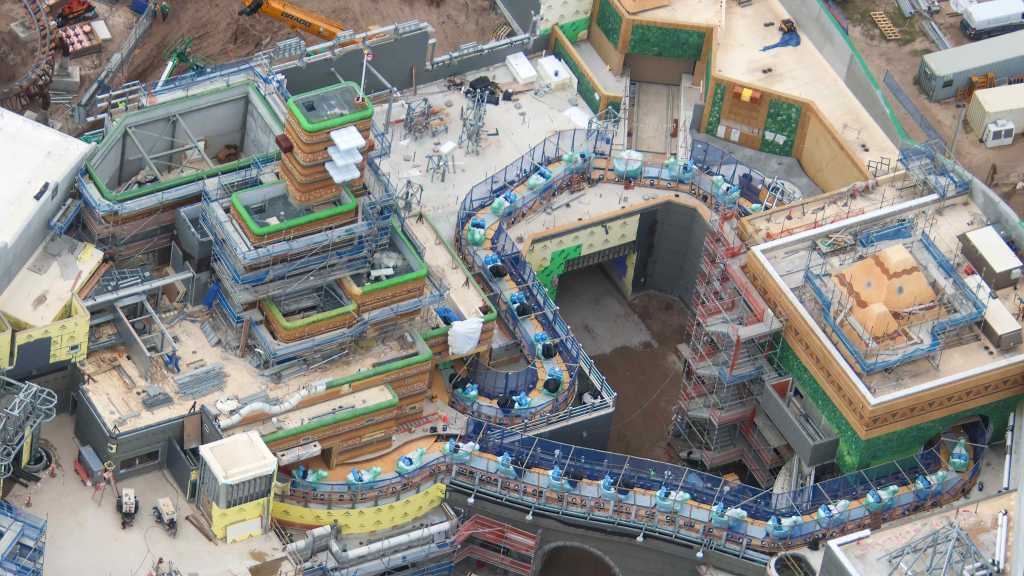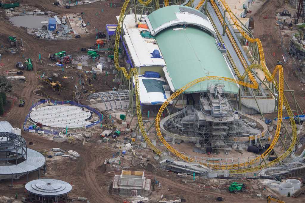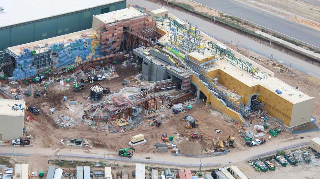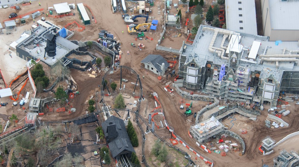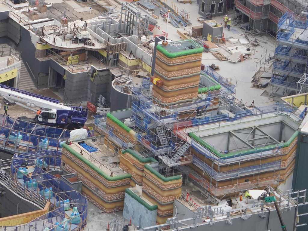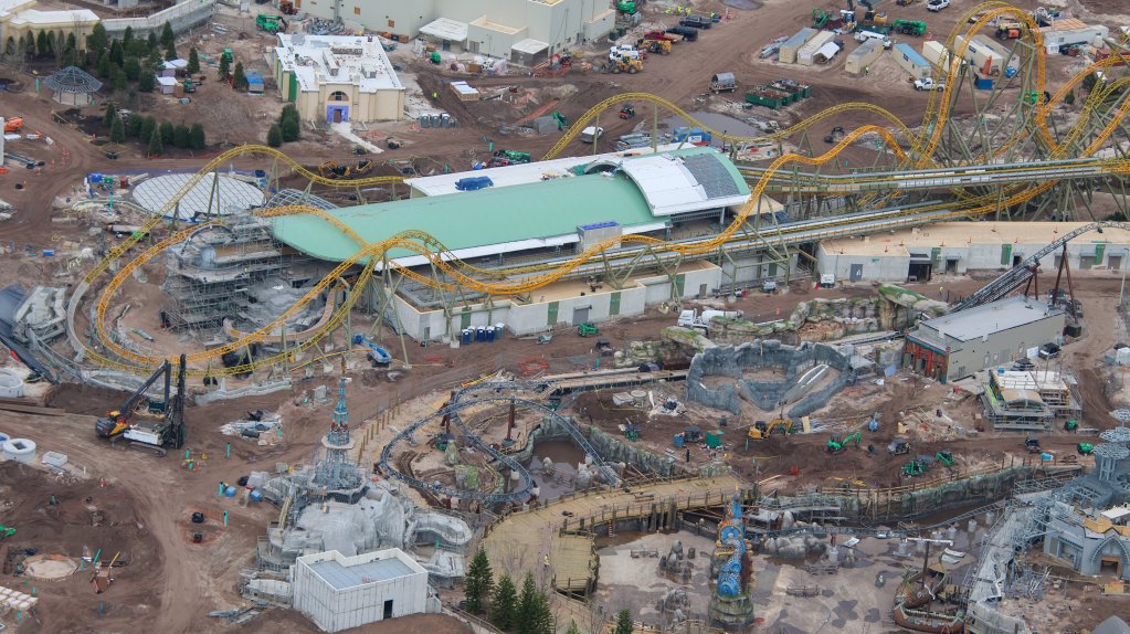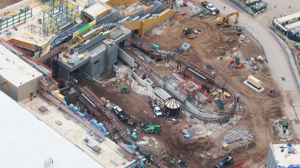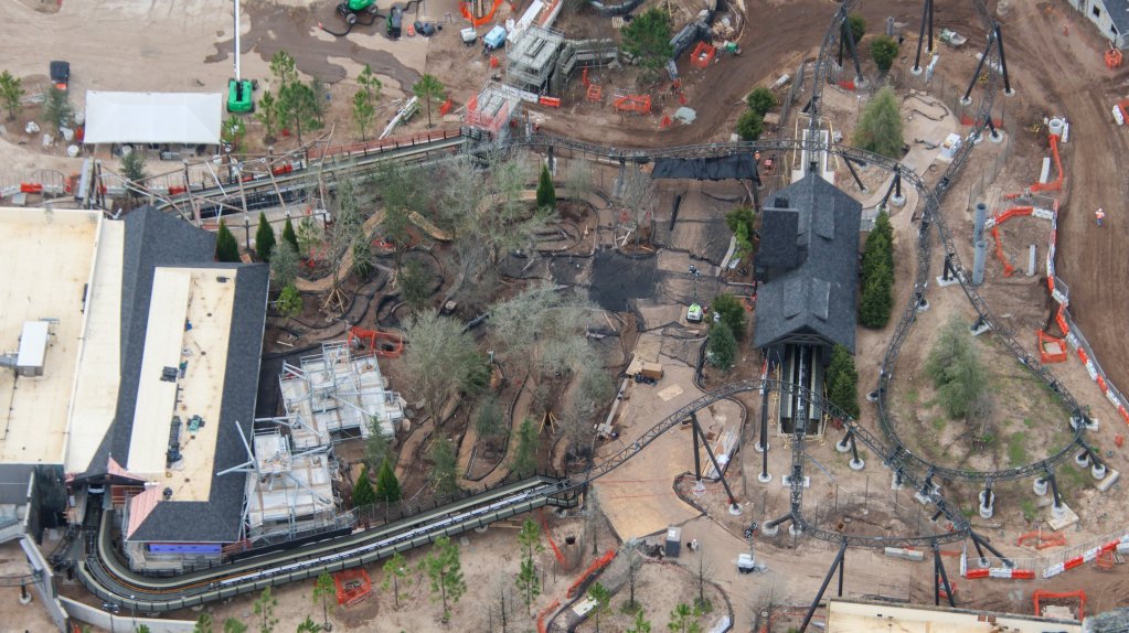 - Image #39: Aerial look at theming in progress at front of the Epic Universe dual-racing roller coaster.