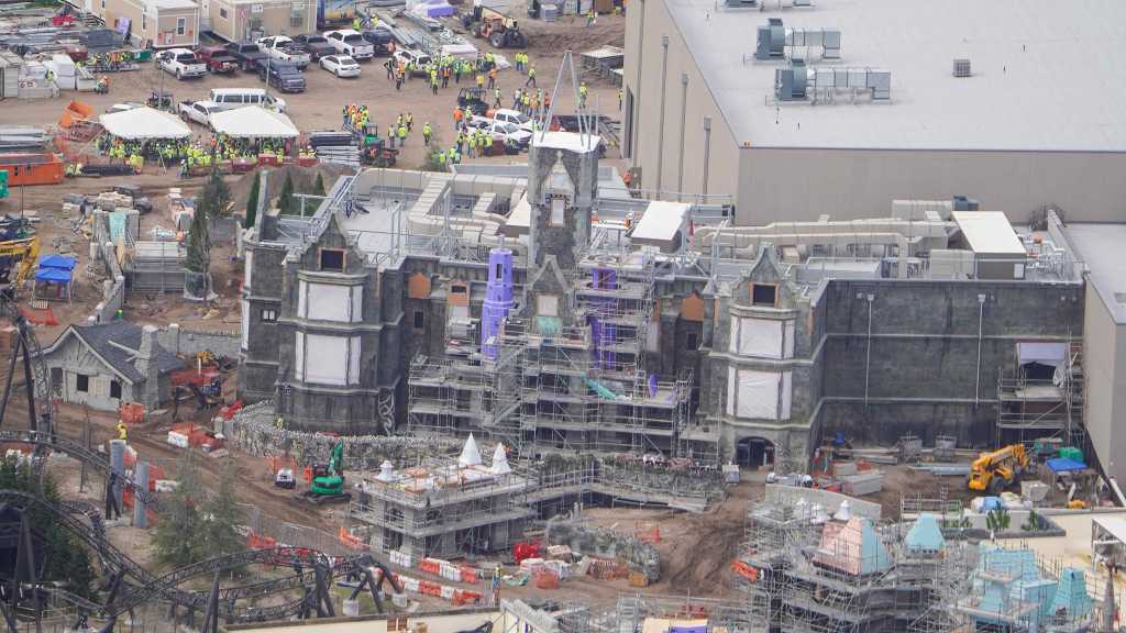 - Image #4: Aerial look at the manor fronting the featured attraction in Dark Universe at Epic Universe. Purple exterior board recently added for the side towers.