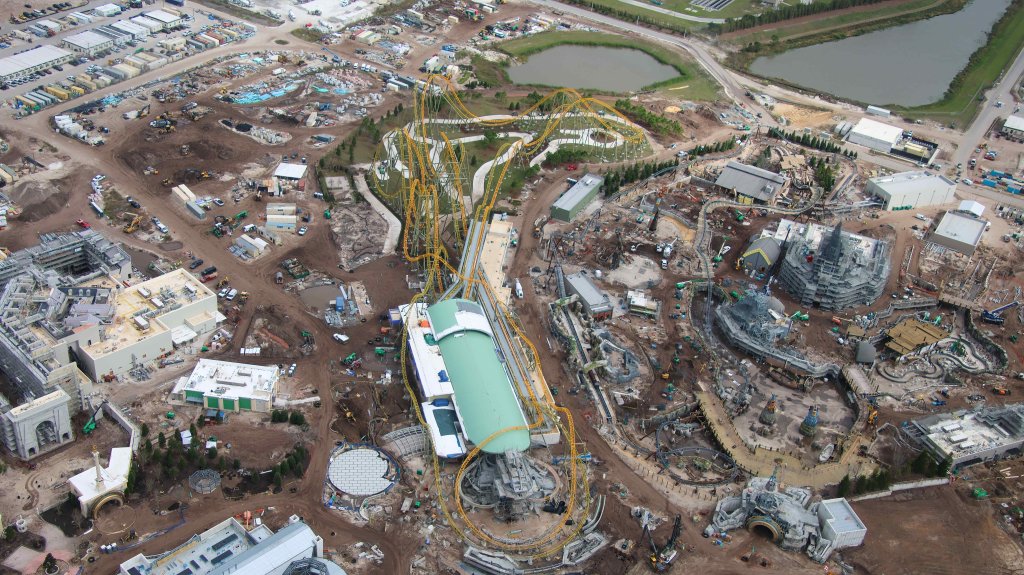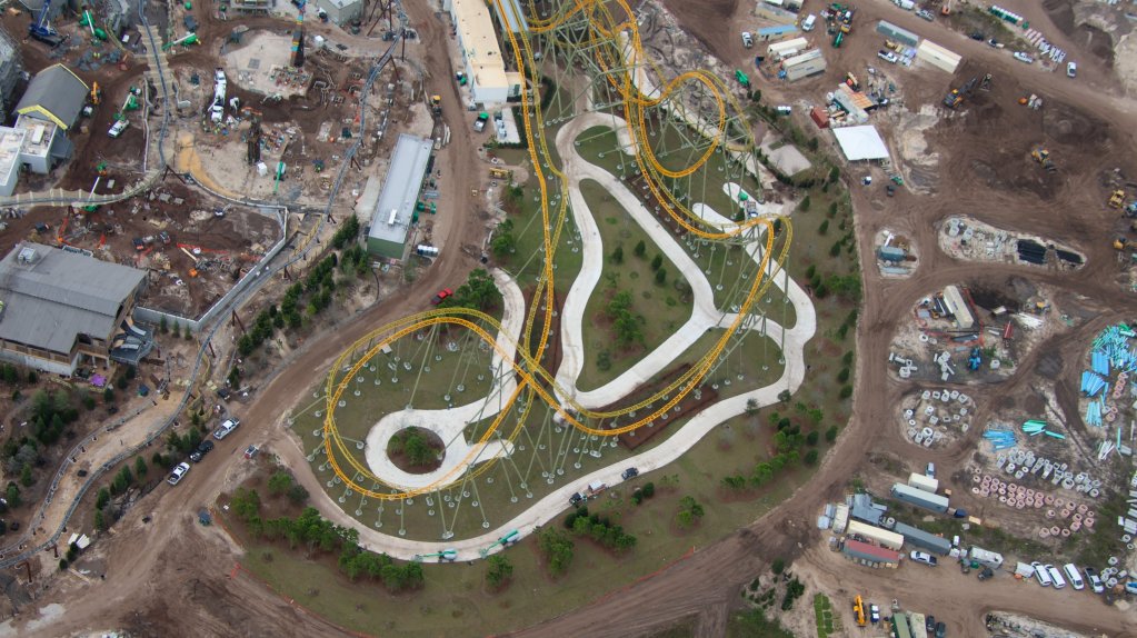 - Image #36: Aerial overview of the Epic Universe dual-racing roller coaster. An expansion pad of the park is at left of the coaster.