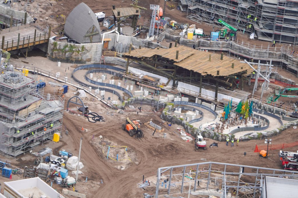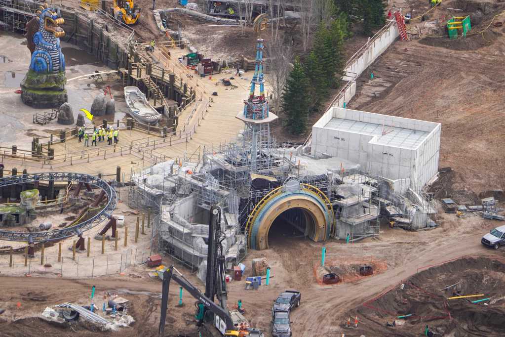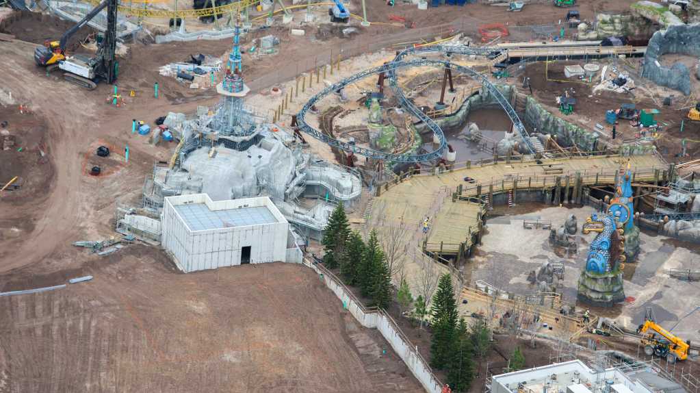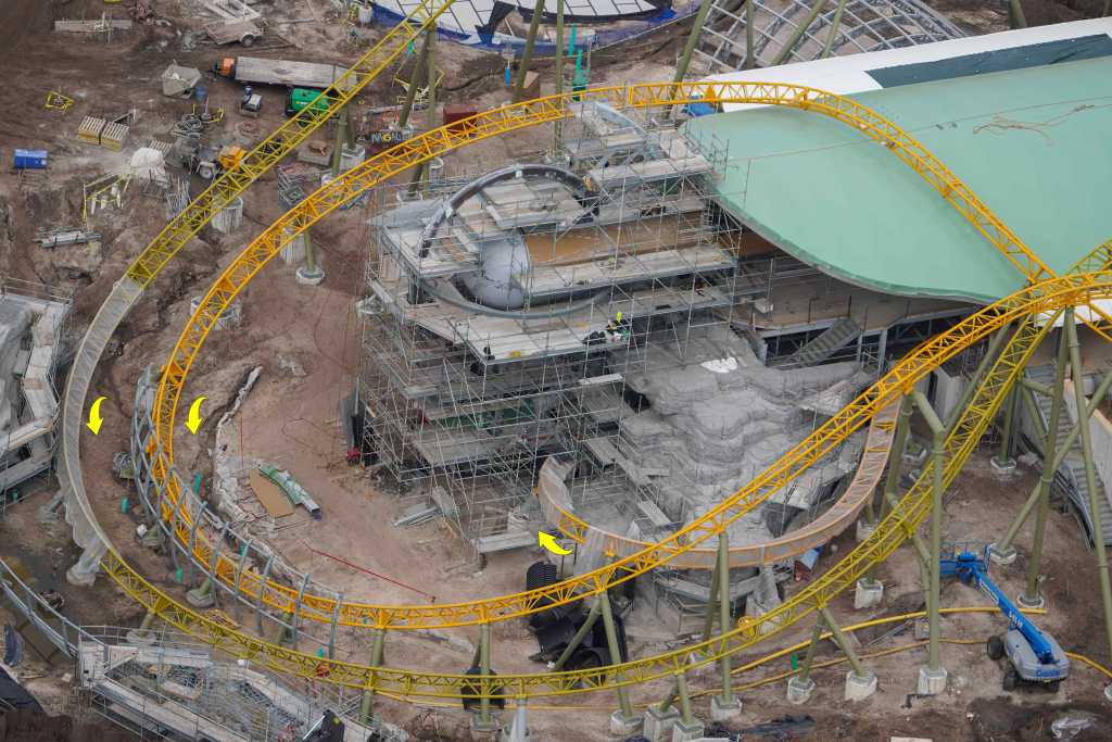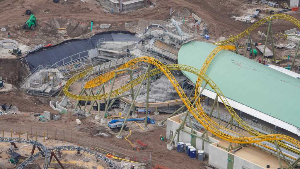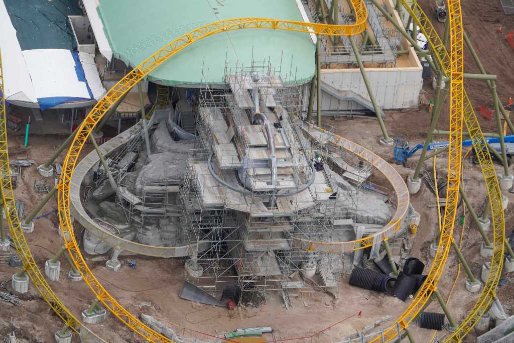 - Image #40: Aerial look at rockwork in progress at front of the Epic Universe dual-racing roller coaster. Trains circle the rock work as they descend from the station to the first launch. Trains also circle in front to reach the second launch.
