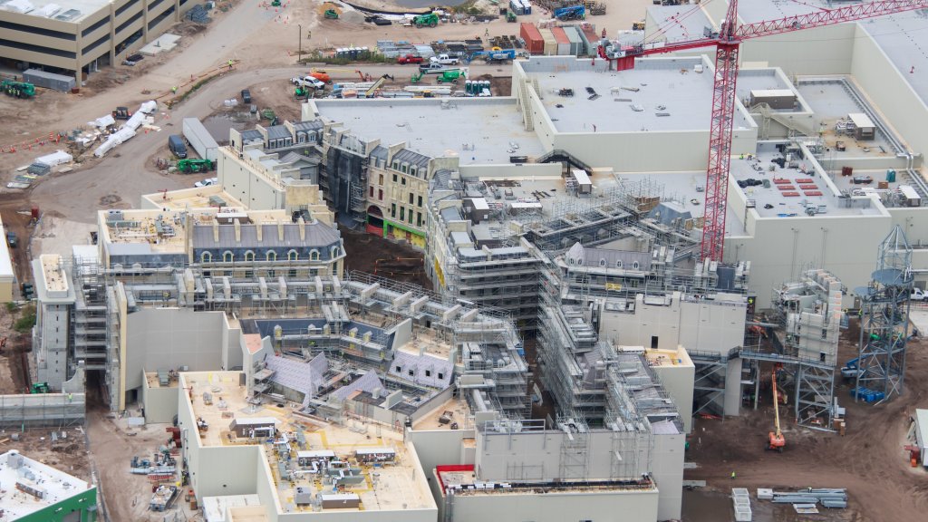 - Image #10: Aerial photo where most scaffolding has been removed in a section of the Harry Potter related land in Epic Universe.