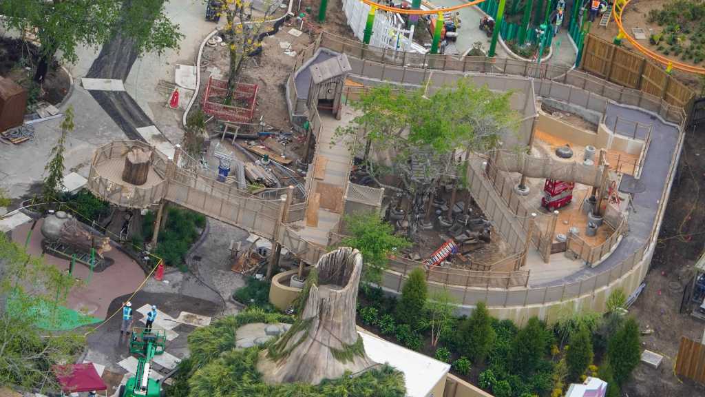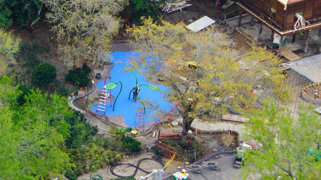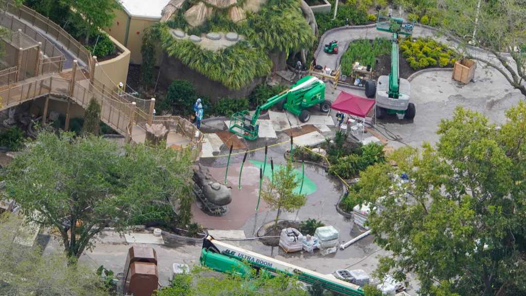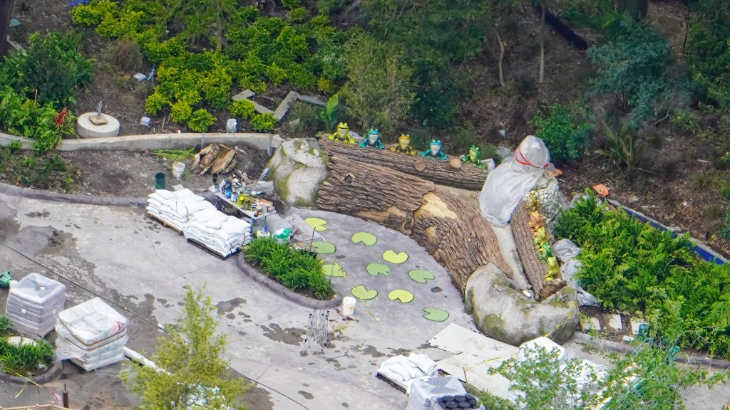 - Image #3, #4: Aerial look at work in progress of a small fountain play area of DWL. Part of Shrek’s Swamp for Little Ogres. A test is in progress and this area is not yet fully themed.