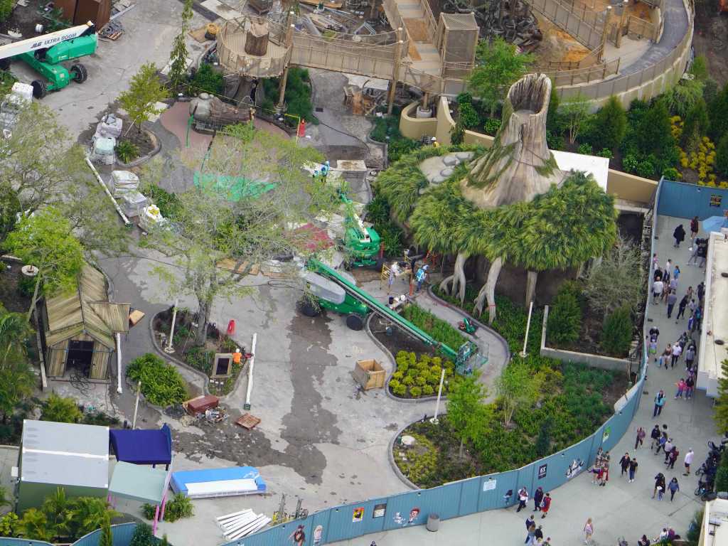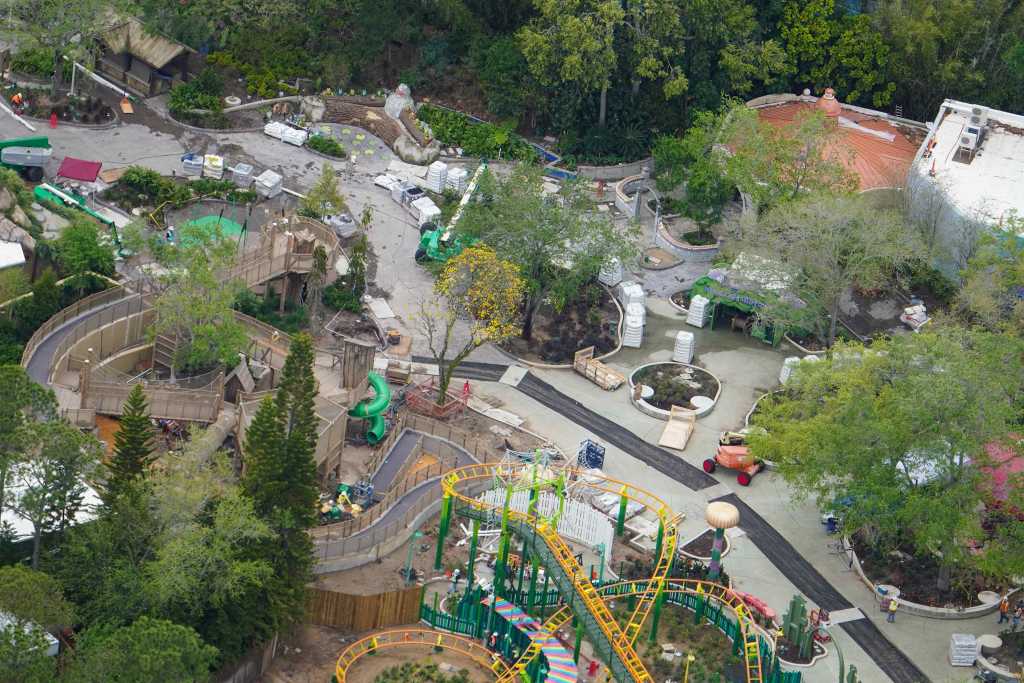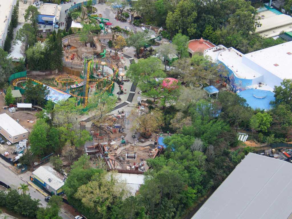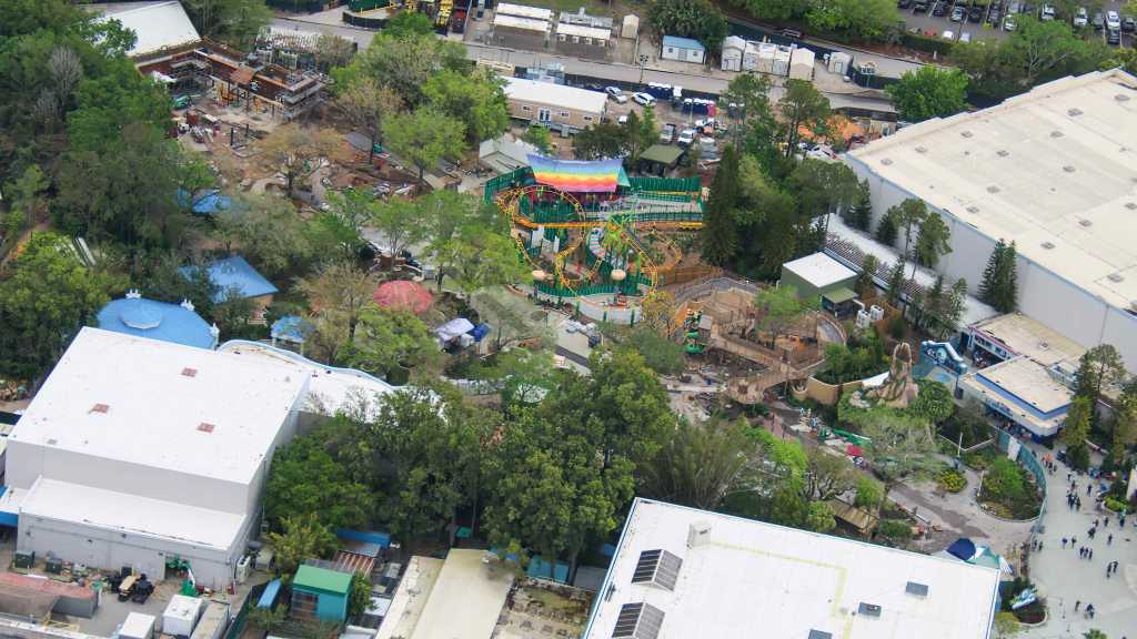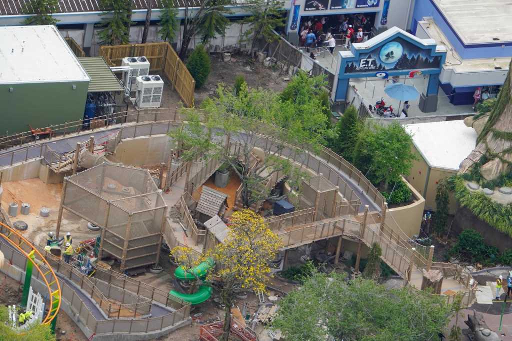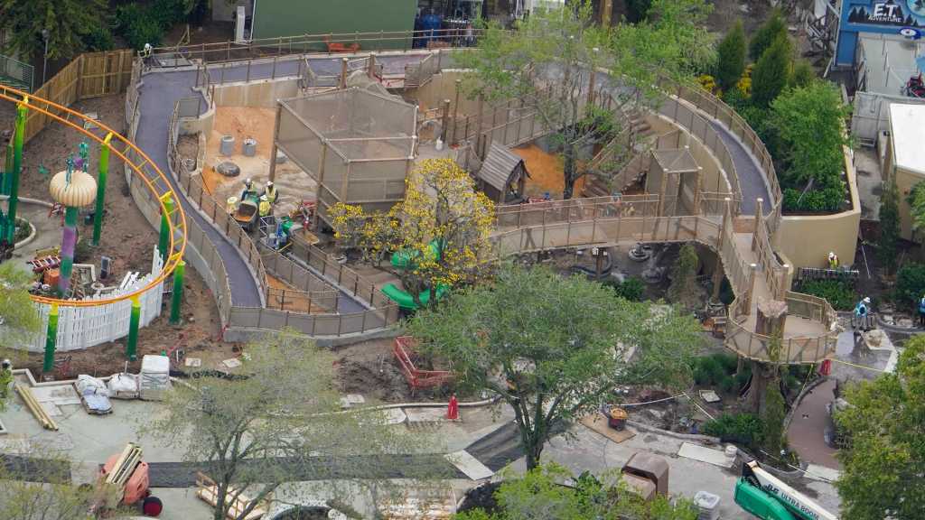 - Image #5: Aerial look at how the E.T. ride currently borders DWL. Shrubs at top right are the most recently added in this area. At bottom left are a pair of DreamWorks character photo ops.