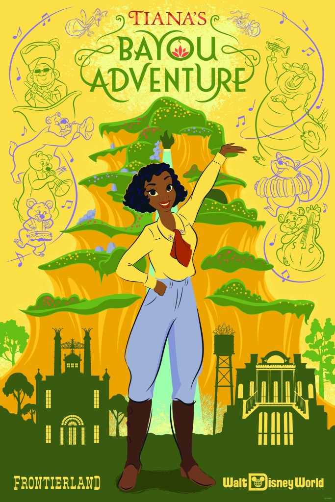 Disney has today revealed the poster for Tiana’s Bayou Adventure. The poster (see below) showcases Tiana and the others who will appear as audio-animatronics throughout the attraction.