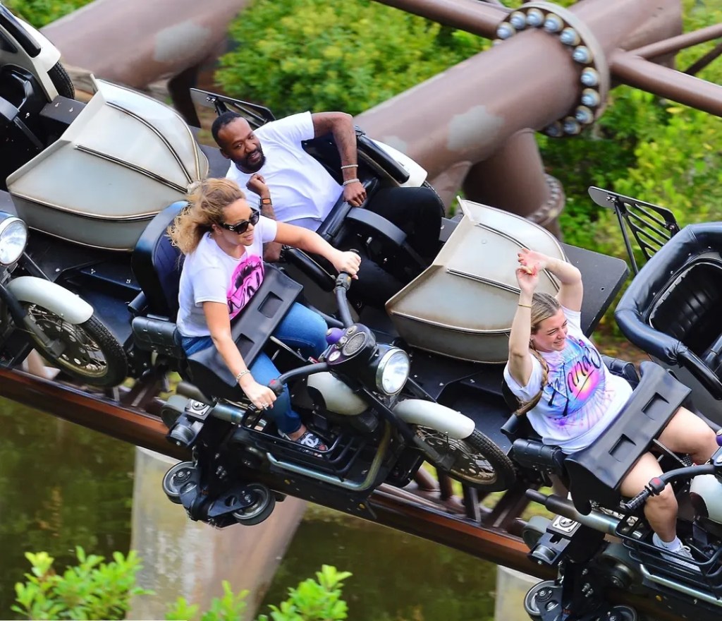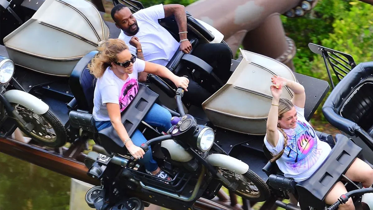 TMZ posted a number of photos (see below) of Carey riding Hagrid’s Magical Creatures Motorbike Adventure in The Wizarding World of Harry Potter – Hogsmeade.