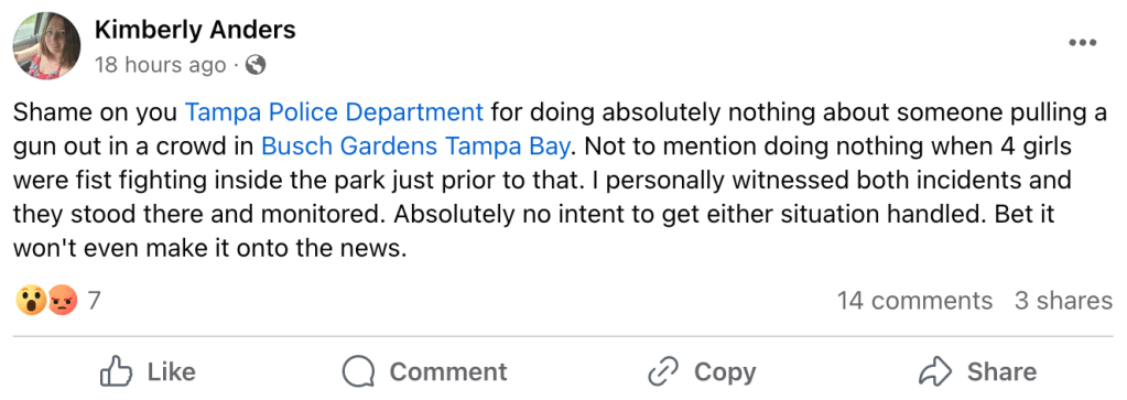 “Shame on you Tampa Police Department for doing absolutely nothing about someone pulling a gun out in a crowd in Busch Gardens Tampa Bay. Not to mention doing nothing when4 girls were fist fighting inside the park just prior to that. I personally witnessed both incidents and they stood there and monitored. Absolutely no intent to get either situation handled. Bet it won’t even make it onto the news.”