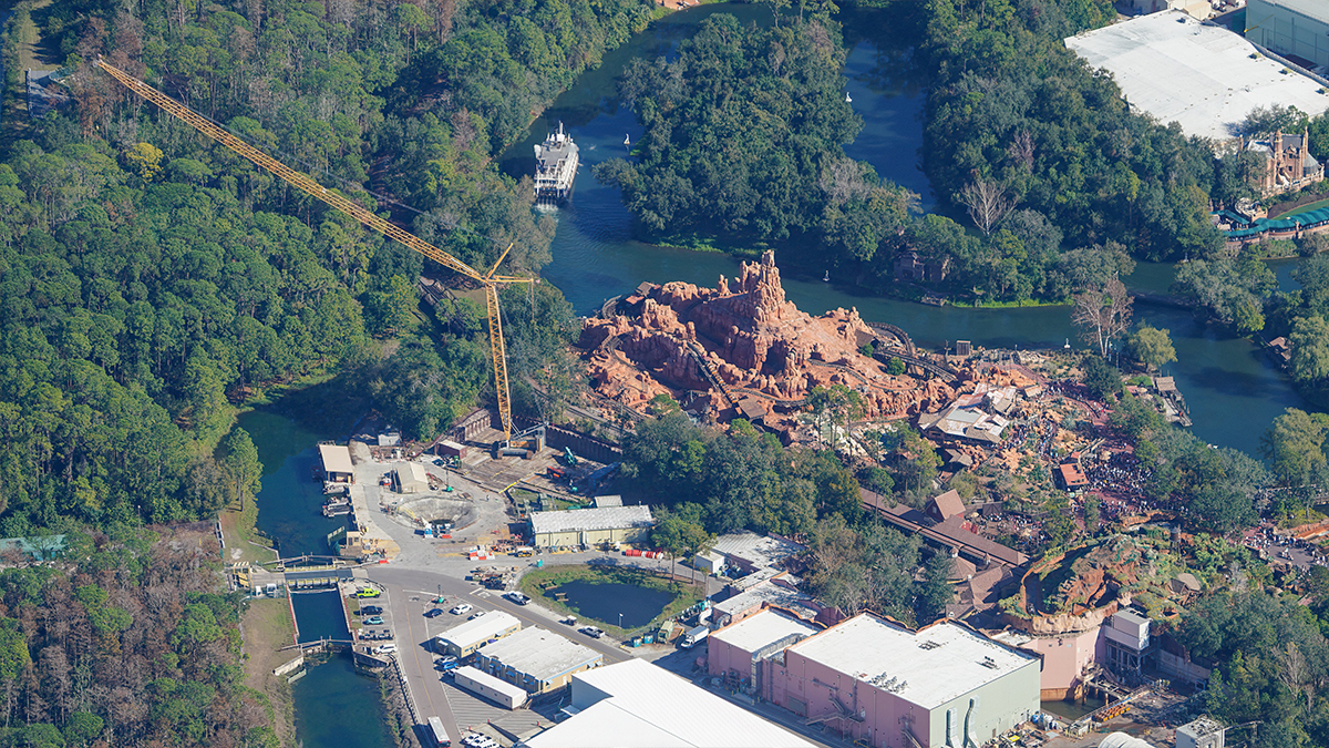 Approximately 17 hours ago, X user @bioreconstruct posted a number of detailed aerial photos of a large crane staged behind Big Thunder Mountain Railroad (BTMR) at the Magic Kingdom.