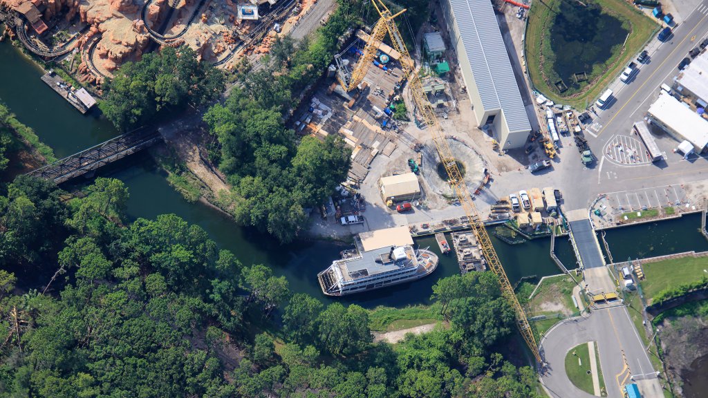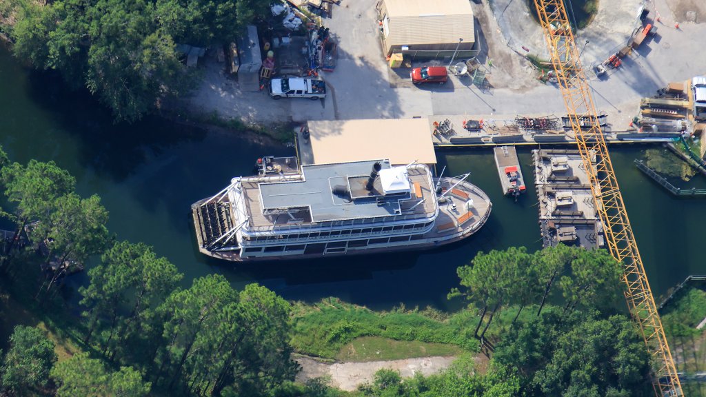 - Image #12: Aerial photo of the Liberty Belle riverboat staged in the MK service canal. Nearby are the TSI [log] rafts. Crane used for refurbishment of Big Thunder Mountain Railroad.