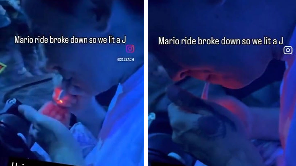 The type of cigarette being lit isn’t clear, however, the person who initially posted the video added the caption “Mario ride broke down so we lit a J.” We can assume J means joint, which is a rolled cannabis cigarette.