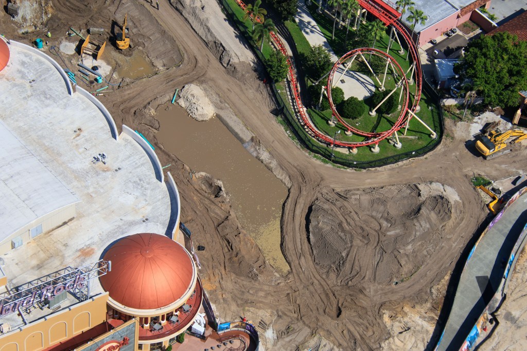 Approximately 16 hours ago, X user @bioreconstruct posted a number of new and detailed aerial photos which show the current progress of site preparation for the attraction replacing Hollywood Rip Ride Rockit (HRRR) at Universal Studios Florida.