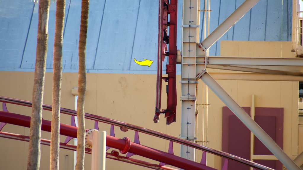 - Image #2: A section of Hollywood Rip Ride Rockit track. Currently over a walkway that will be used by [Halloween Horror Nights] guests to reach 4 event houses. Arrow where another section of track has been cut, and also covered.