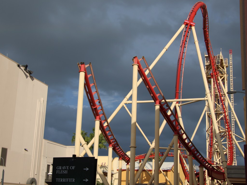 - Image #1: Looking up at Hollywood Rip Ride Rockit track, from the [Halloween Horror Nights] route to four event houses.