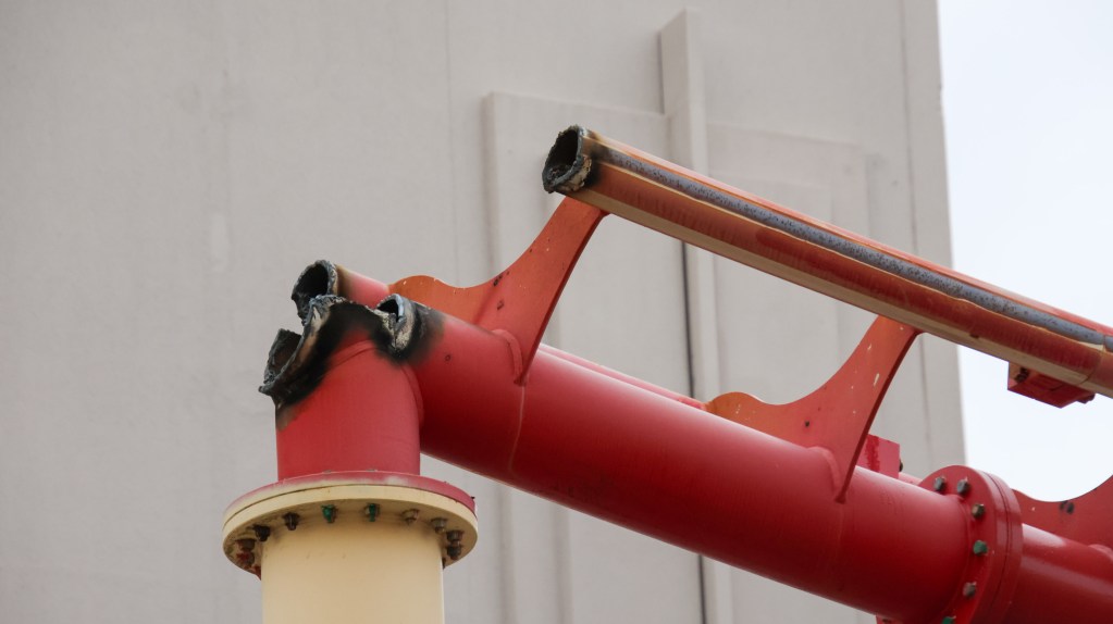 - Image #4: Part of the demolition process at HRRR includes making rectangular openings in the track beams. Photo 1 (Image #4) has steel hanging at the firehouse curve.