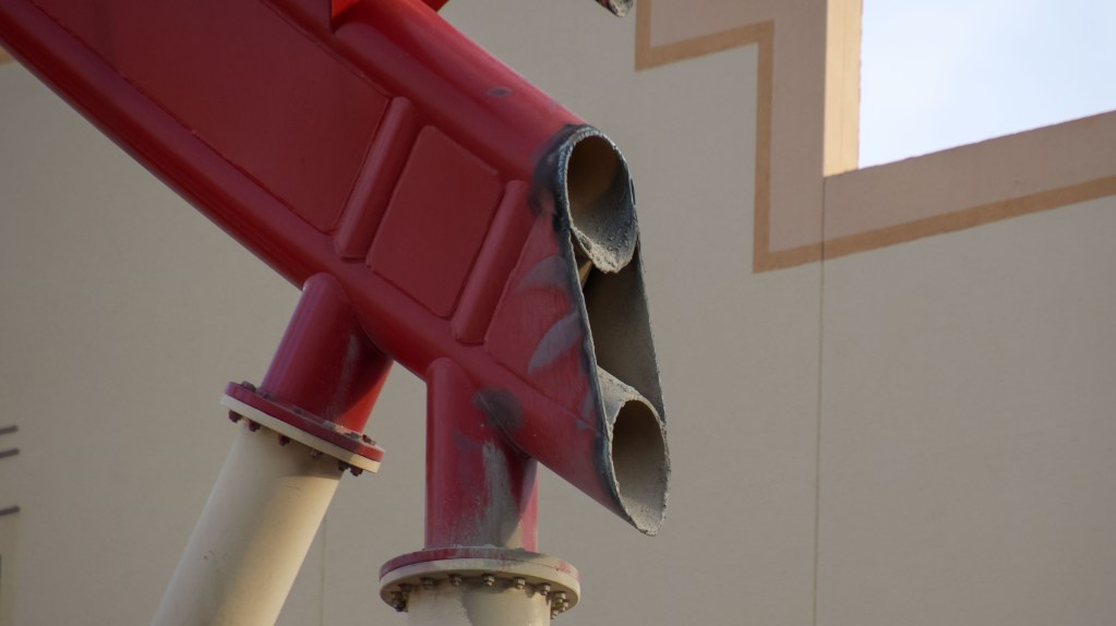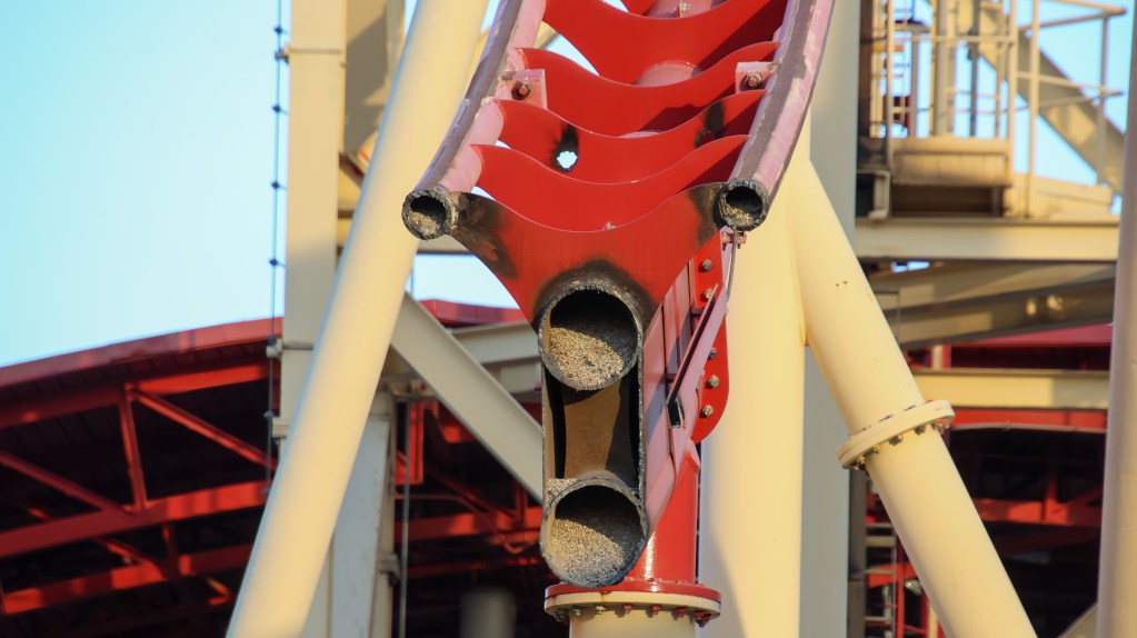 - Image #13, #14, #15: Photos of cuts in the HRRR track. Behind the Music Plaza stage. Sand-filled track is technique to reduce roller coaster noise and also ride vehicle vibration.