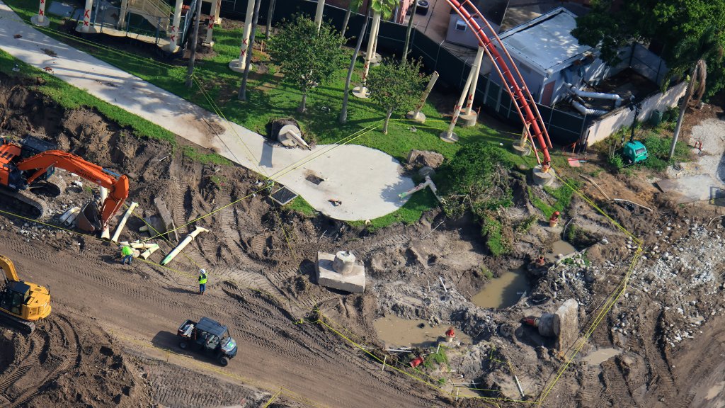 Approximately two hours ago, X user @bioreconstruct posted a number of new and detailed aerial photos which show the demolition progress of Hollywood Rip Ride Rockit (HRRR) at Universal Studios Florida