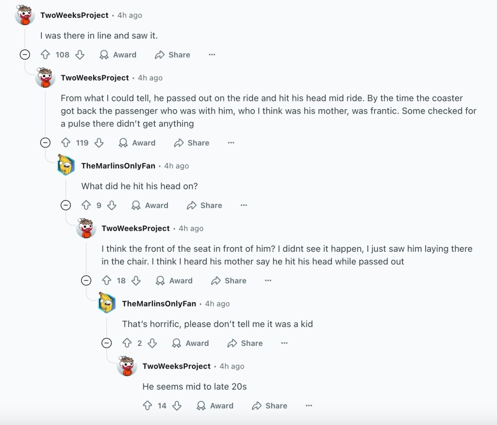 “I was there and in line and saw it. From what I could tell, he passed out on the ride and hit his head mid-ride. By the time the coaster got back, the passenger who was [with the guest*] was frantic. Some checked for a pulse there and didn’t get anything.”