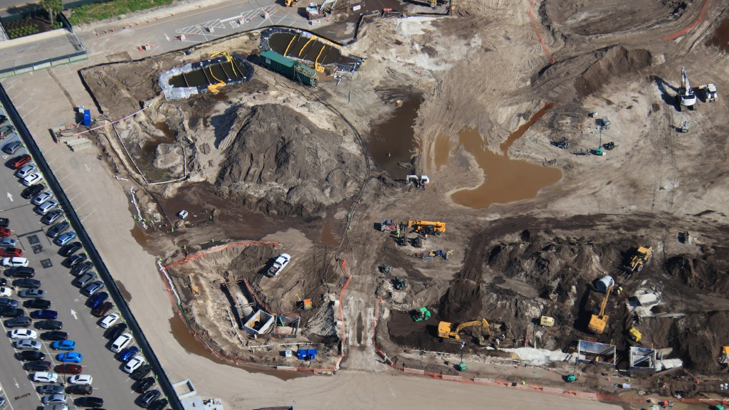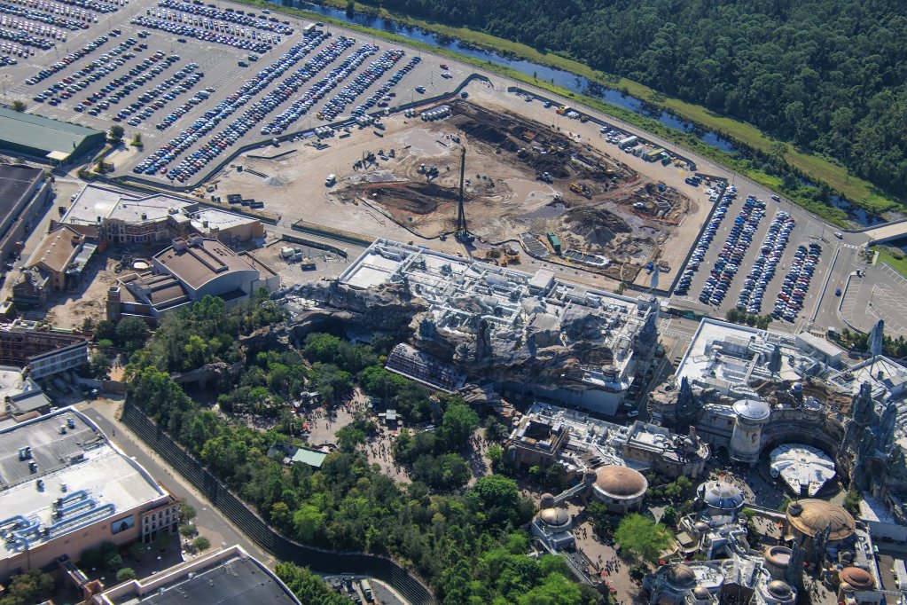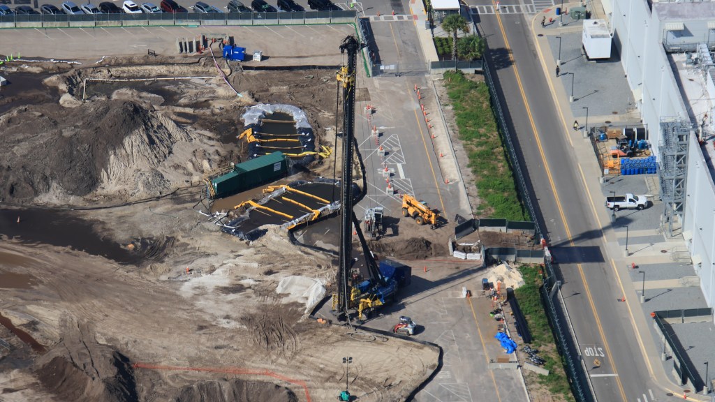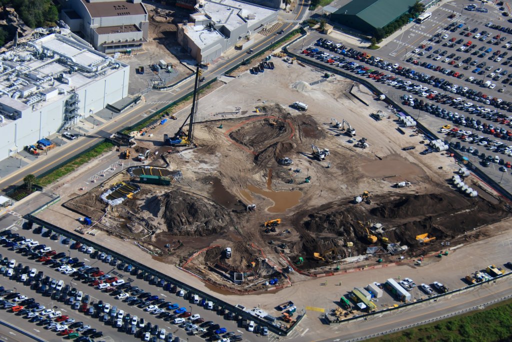- Image #2,#3,#4: Aerial photos of infrastructure construction at site of the gravity or show building of a Monsters, Inc. roller coaster in Hollywood Studios.