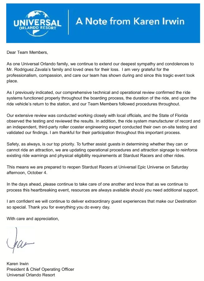 Karen Irwin, Universal Orlando President and COO, has confirmed in an email to Team Members that operational procedures and signage for Stardust Racers and other attractions at Universal’s Epic Universe are being updated.