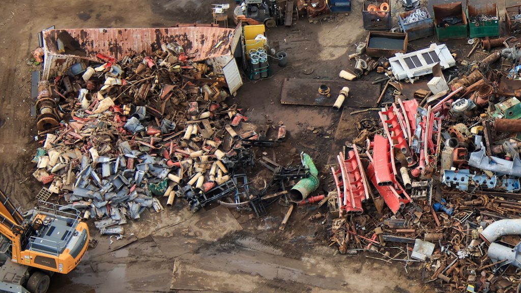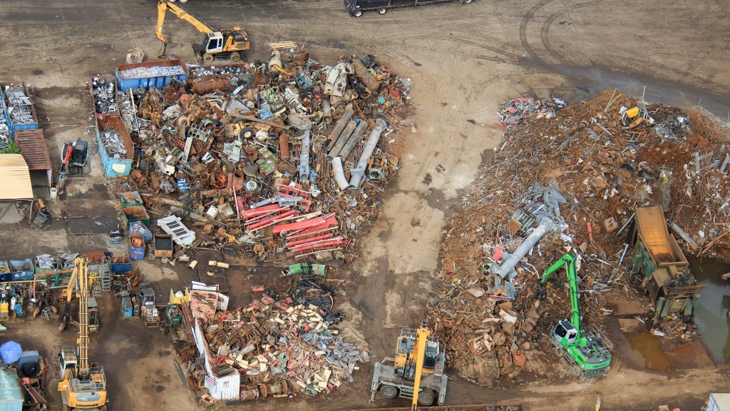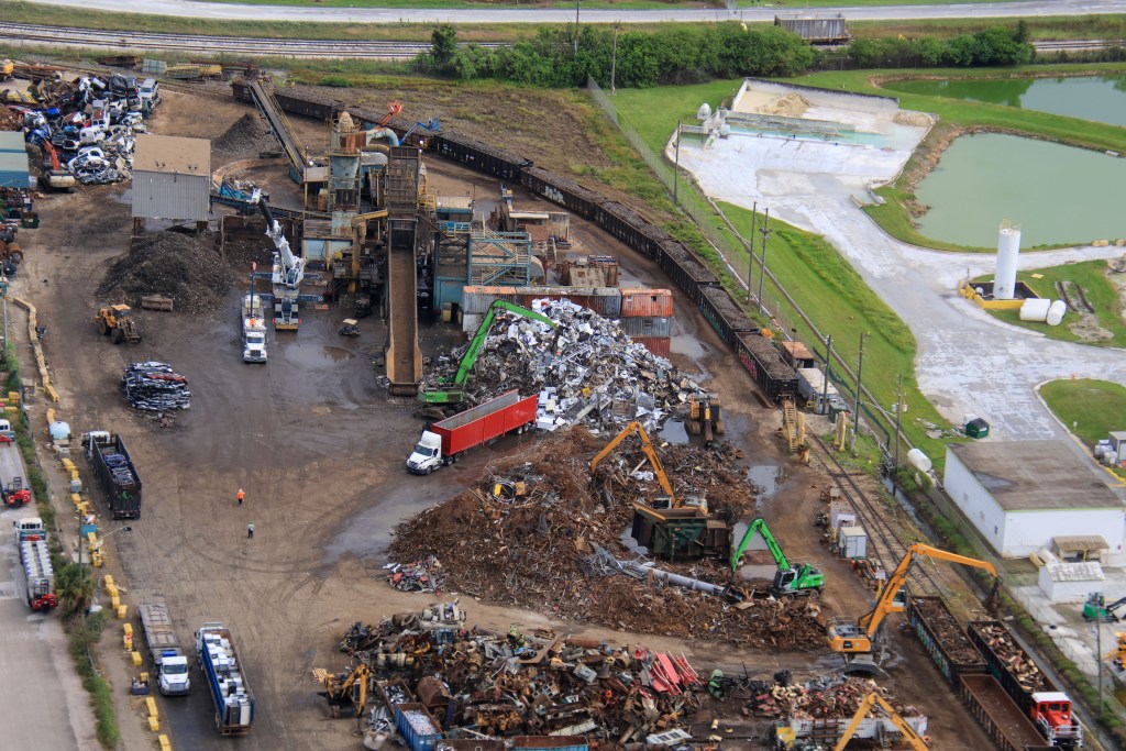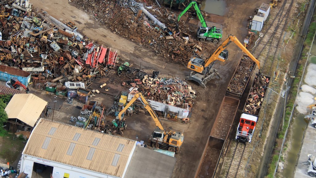 - Image #5: At top of this aerial photo is a shredder for sheet and other lighter metals. Rendered metal then transferred to rail cars. At bottom are thick metal pieces, including HRRR track. Transferred in this form to rail car, for shipping to a foundry.