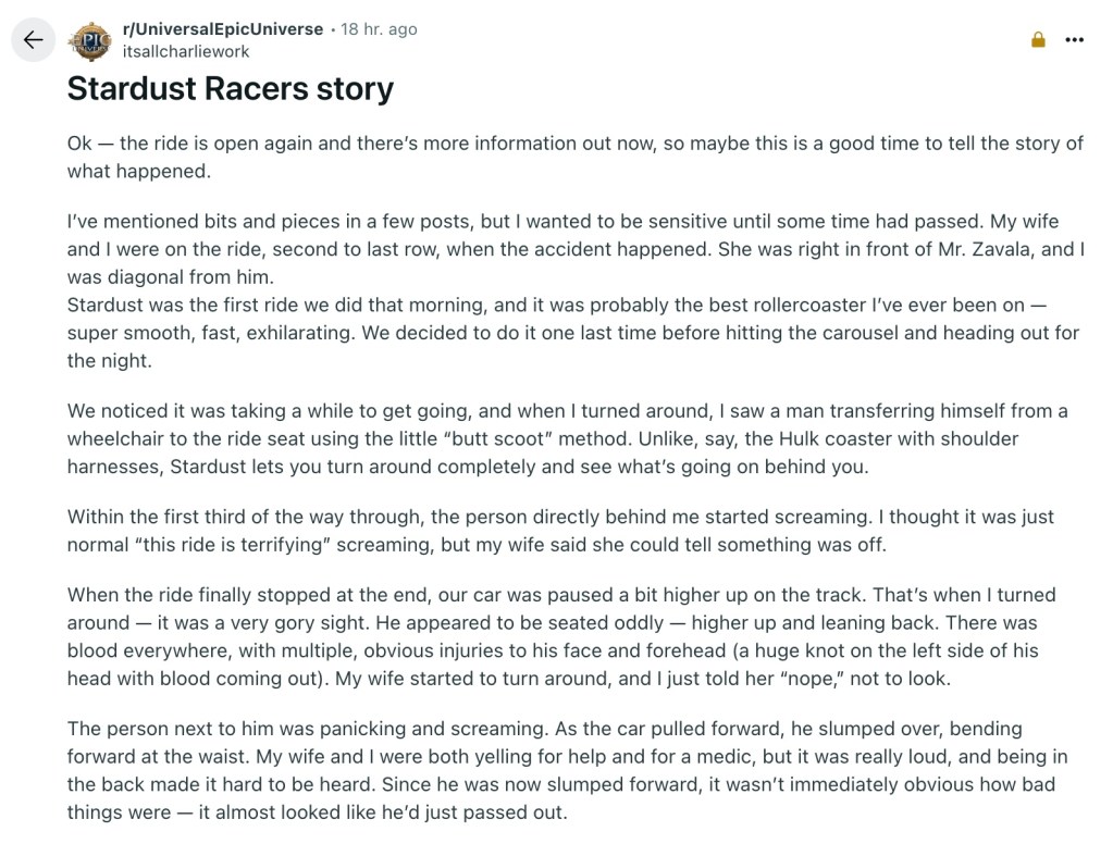 According to a post on Reddit, an alleged eyewitness riding the same Stardust Racers train with Kevin Rodriguez Zavala onboard said “there was blood everywhere” when it returned to the loading station.