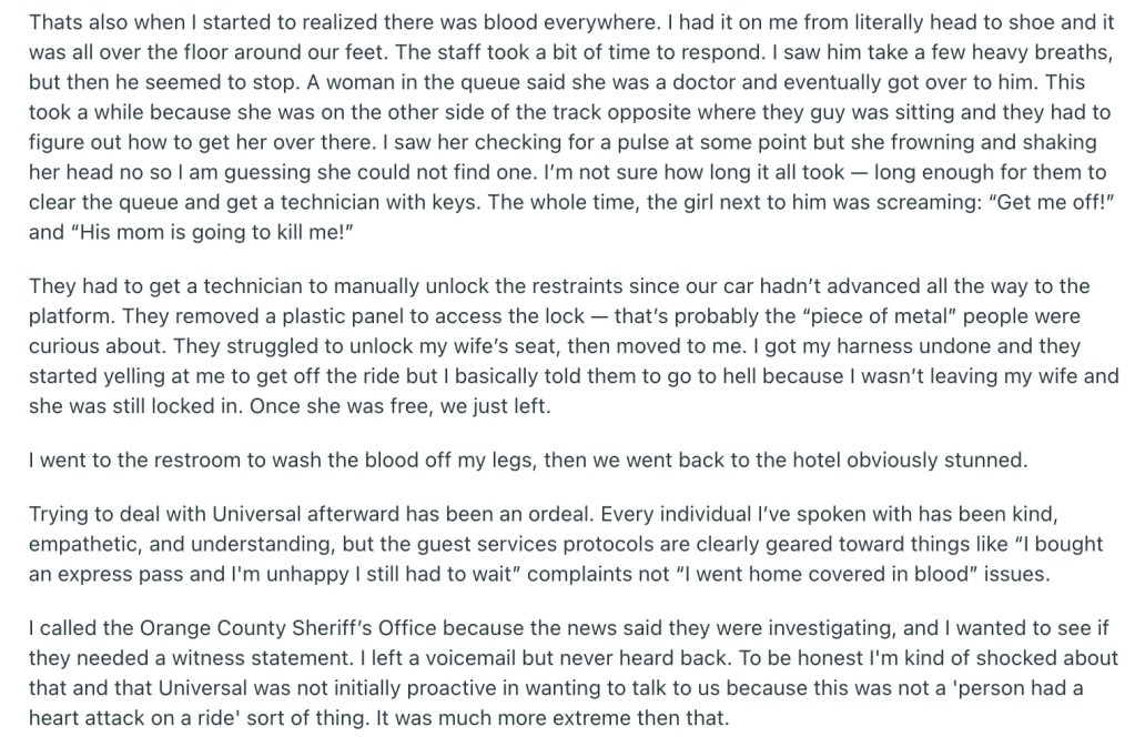 I called the Orange County Sheriff’s Office because the news said they were investigating, and I wanted to see if they needed a witness statement. I left a voicemail but never heard back. To be honest I’m kind of shocked about that and that Universal was not initially proactive in wanting to talk to us because this was not a ‘person had a heart attack on a ride’ sort of thing. It was much more extreme than that.”