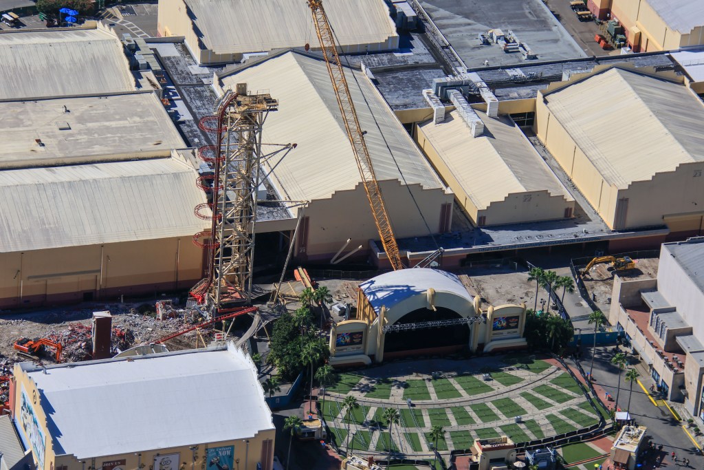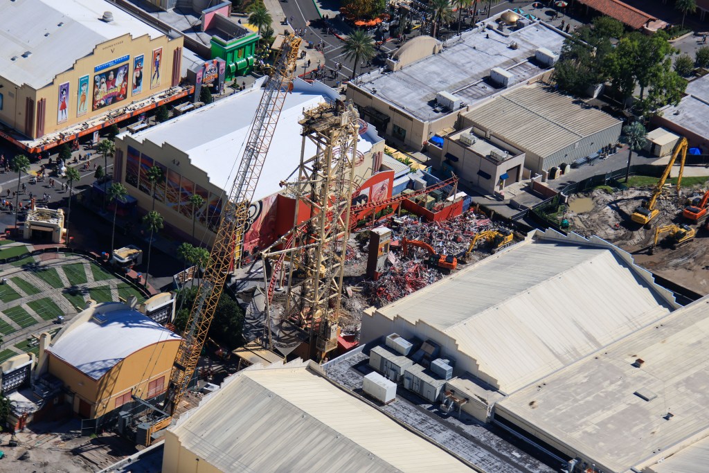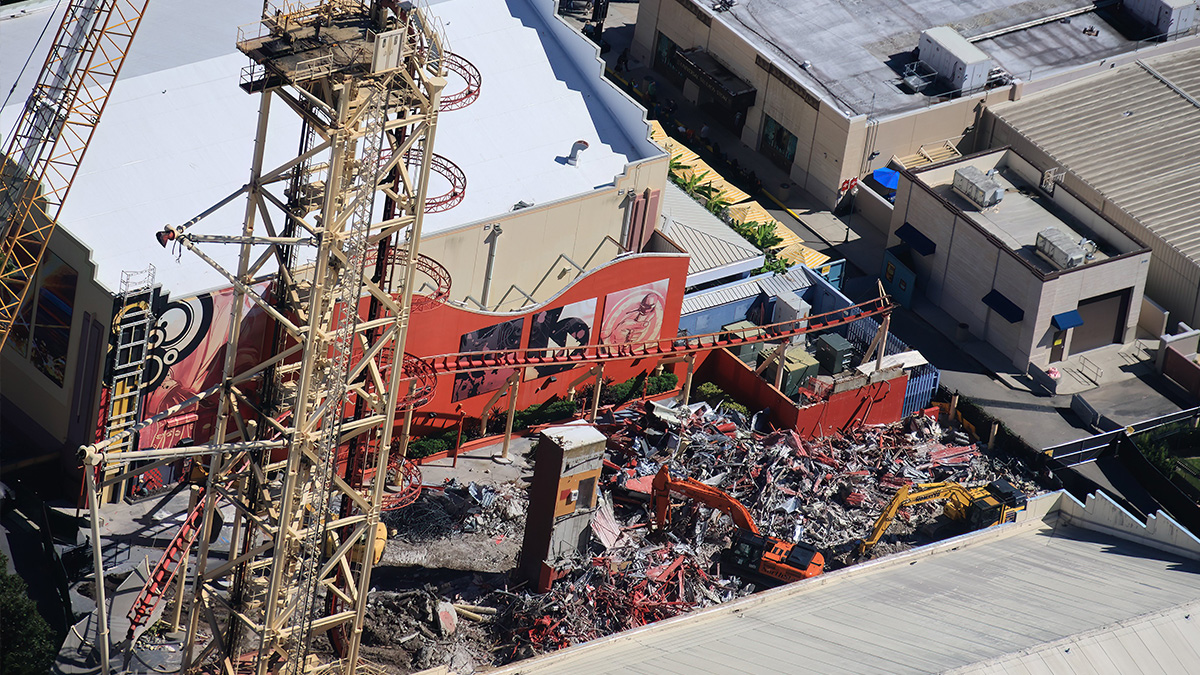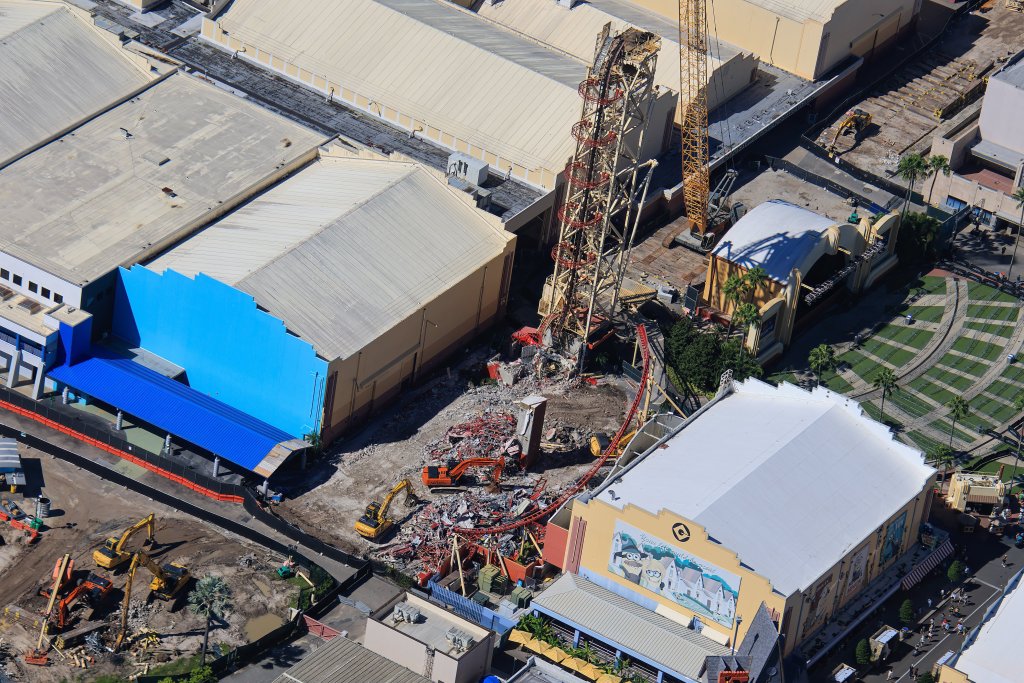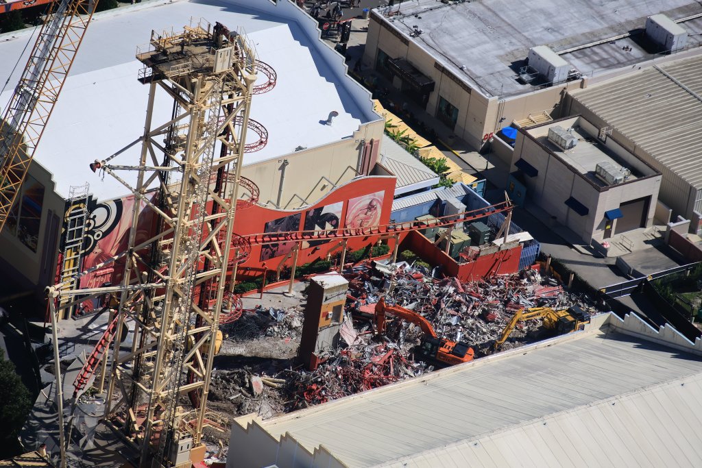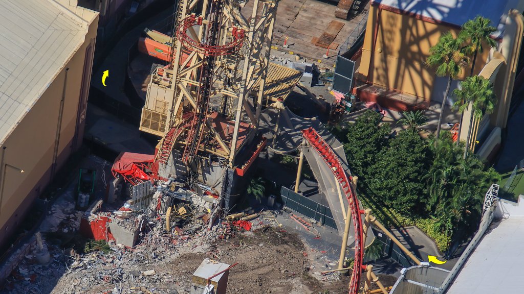 - Image #2, #3: Aerial photos of the demolition of the Hollywood Rip Ride Rockit station. Arrows in first photo (Image #2) are the guest route through the demolition site to access a [Halloween Horror Nights] soundstage house.