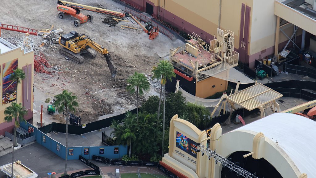 - Image #2: Aerial photo of fencing for a [Halloween Horror Nights] queue access through the demolition of HRRR. All the remains of HRRR is the service elevator platform. Demolition shear also seen at left.