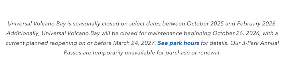 According to Inside Universal, the suspension “coincides with Volcano Bay’s upcoming seasonal schedule.” Seasonal schedule effectively means the Universal Orlando water park operates on reduced park hours during colder months. Volcano Bay will also close in October 2026 for maintenance.