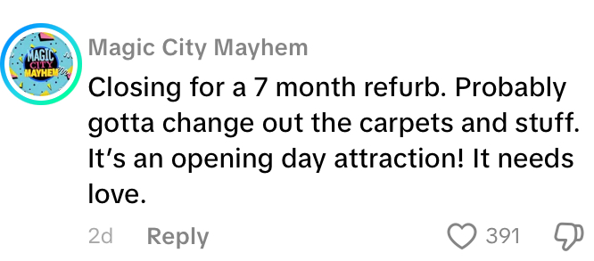“Closing for a 7-month refurb. Probably [got to] change out the carpets and stuff. It’s an opening day attraction! It needs love.”