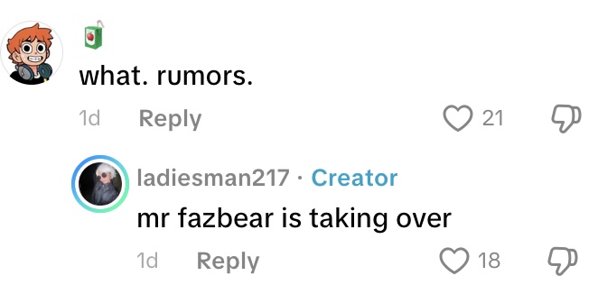 “They made a joke about the show being changed,” @funtimefreddyvlogs/@ladiesman217 replied to @floridathrills question “Rumor?”.