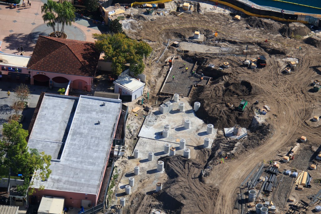 - Image #17: Aerial look at roller coaster construction USF. Wood boxes near Hard Rock Café (bottom right of Image #17) cover bolts in buried footers.