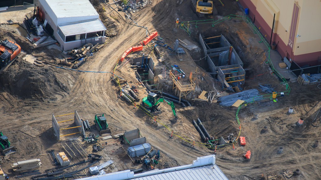 - Image #9: Aerial photo shows diggings for utilities in roller coaster construction site at USF. Platform (centre of Image #9) allows maintenance Team Members access to a manhole cover.
