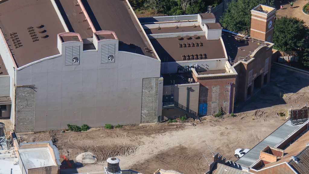 - Image #1: Aerial look at masonry changes on the former Muppet Vision 3D show building. Monstropolis concept art suggests this will be The Glob Theater.