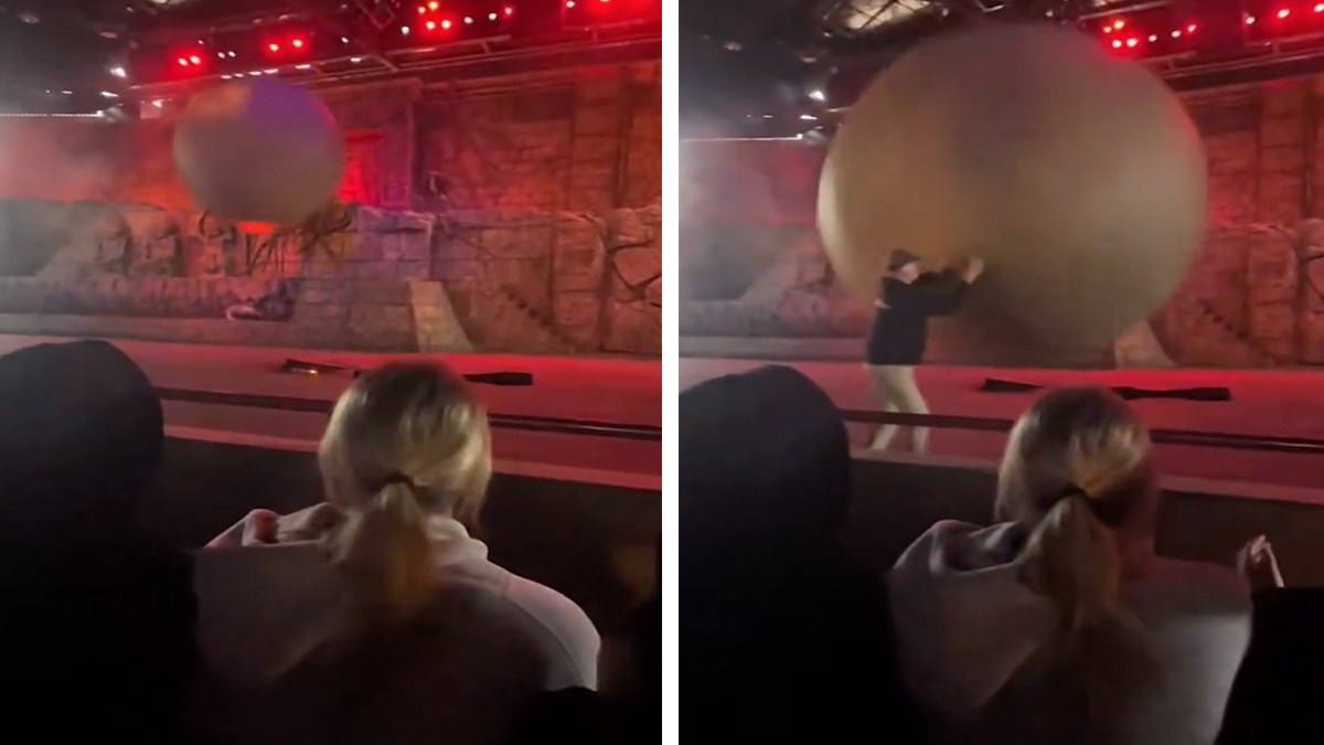 A video posted on X shows the moment a Cast Member is knocked down to the ground by the runaway boulder prop during an Indiana Jones Epic Stunt Spectacular! Performance at Disney’s Hollywood Studios.