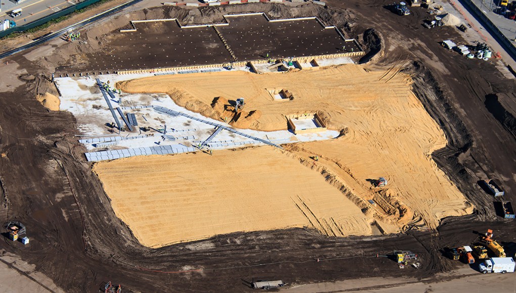 - Image #2: Aerial photo shows construction of Monstropolis roller coaster show building in Disney’s Hollywood Studios. The building’s floor and electric conduits are being buried in sand. Concrete forms can also be seen in Image #2.