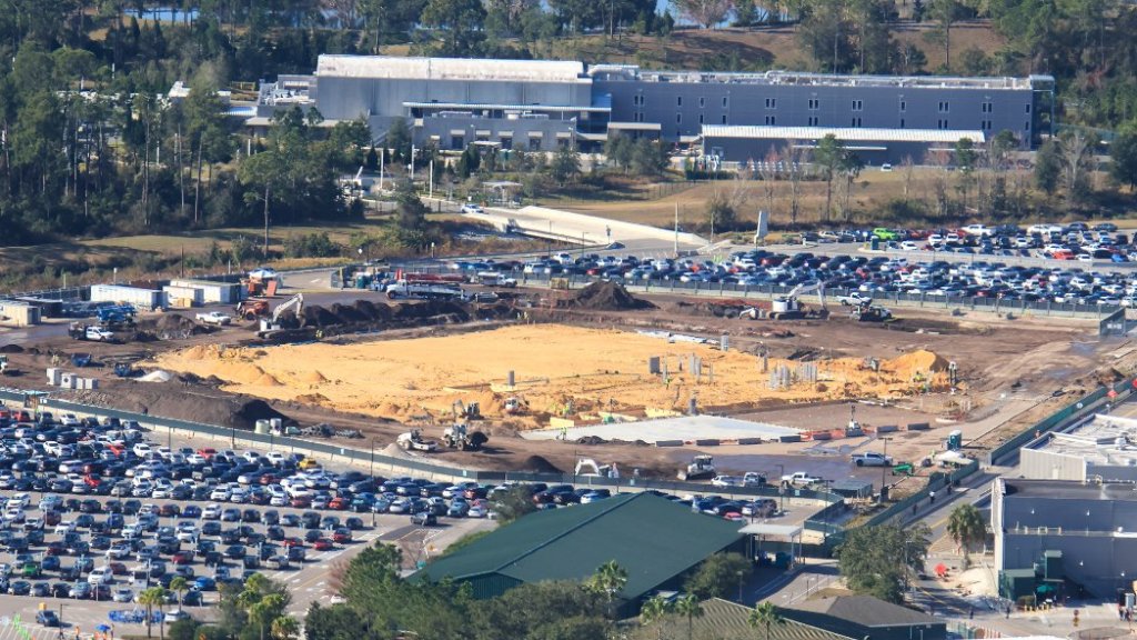 - Image #1: Aerial look at Monstropolis roller coaster construction site in Disney’s Hollywood Studios. Utility conduits placed in the sand on top of show building’s concrete floor, similar to parts of building. In case you didn’t know, this area used to be wetlands.