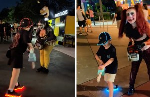Watch a brilliant interaction between a child with a bubble blowing toy chainsaw and Halloween Horror Nights 34 (HHN 34) scareactors...
